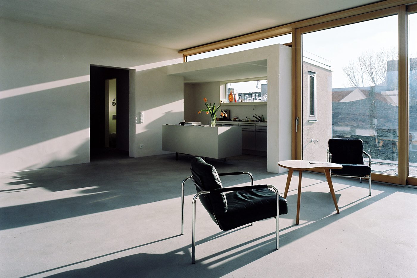 Para evitar custos e esforços desproporcionais, decidimos não construir um porão no lençol freático. A massa do edifício, feita de materiais de construção minerais e tijolo, é barata, durável, reciclável e armazena energia.