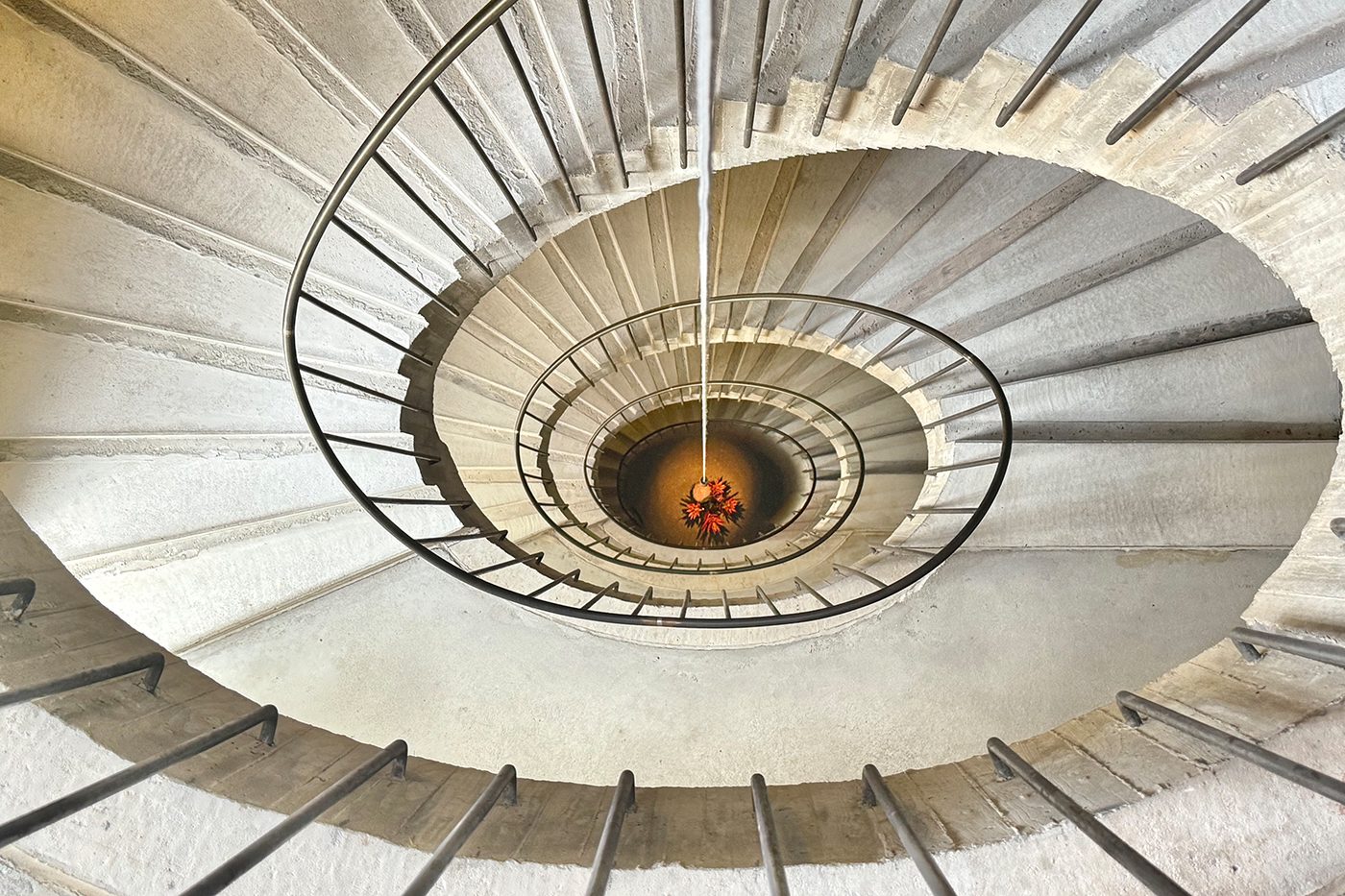 Gesso, ou superfícies de reboco não tratadas, dão caráter aos cômodos, enquanto pisos e tetos de concreto criam uma sensação arcaica de espaço. Os visitantes são recepcionados em um salão de pedra acima do qual uma escada espiral de pedra se eleva elasticamente para cima.