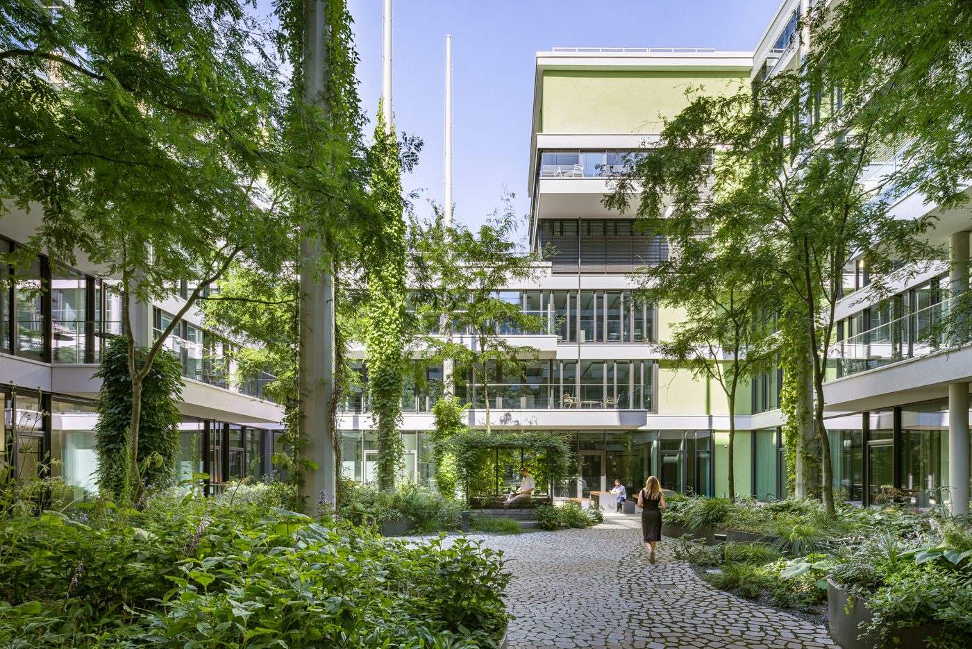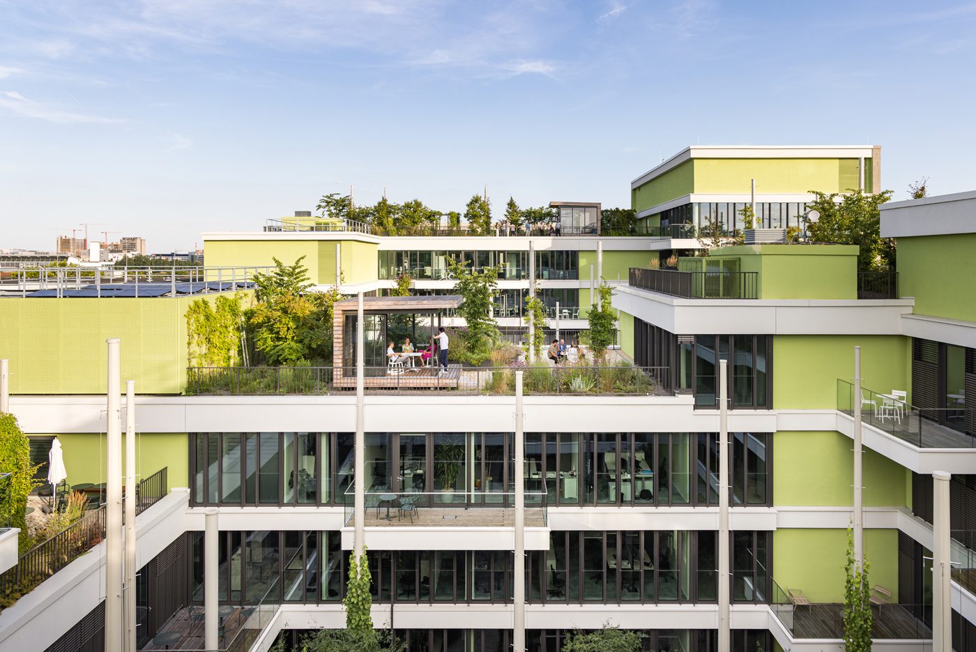 Neste sentido, estes pátios verdes internos, varandas e terraços formam o coração significativo do edifício. Os terraços oferecem áreas especiais de recreação com pavilhões e espaços de trabalho rodeados por vegetação.