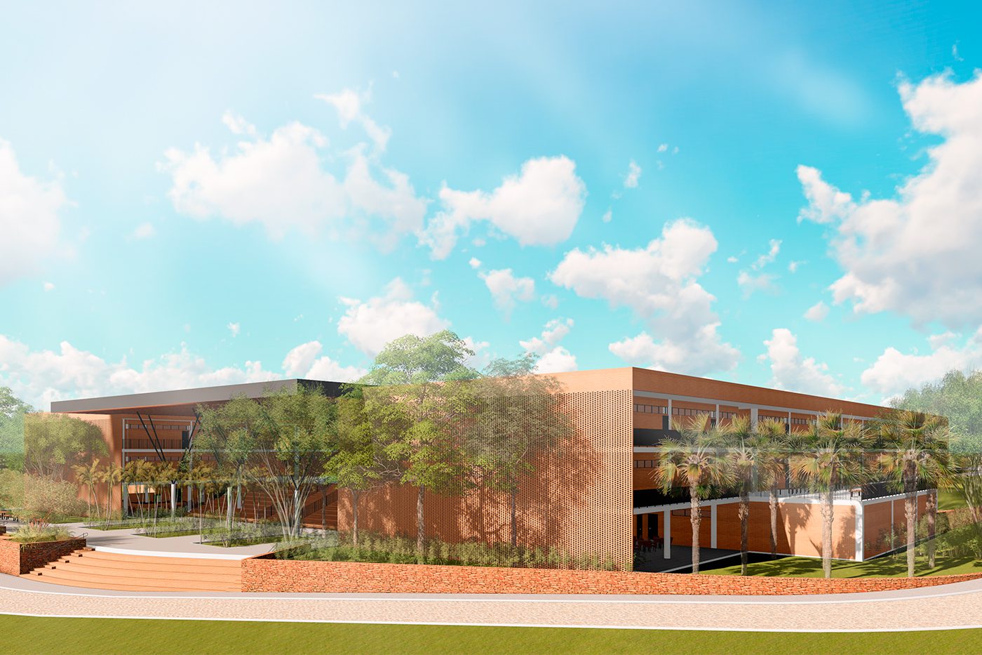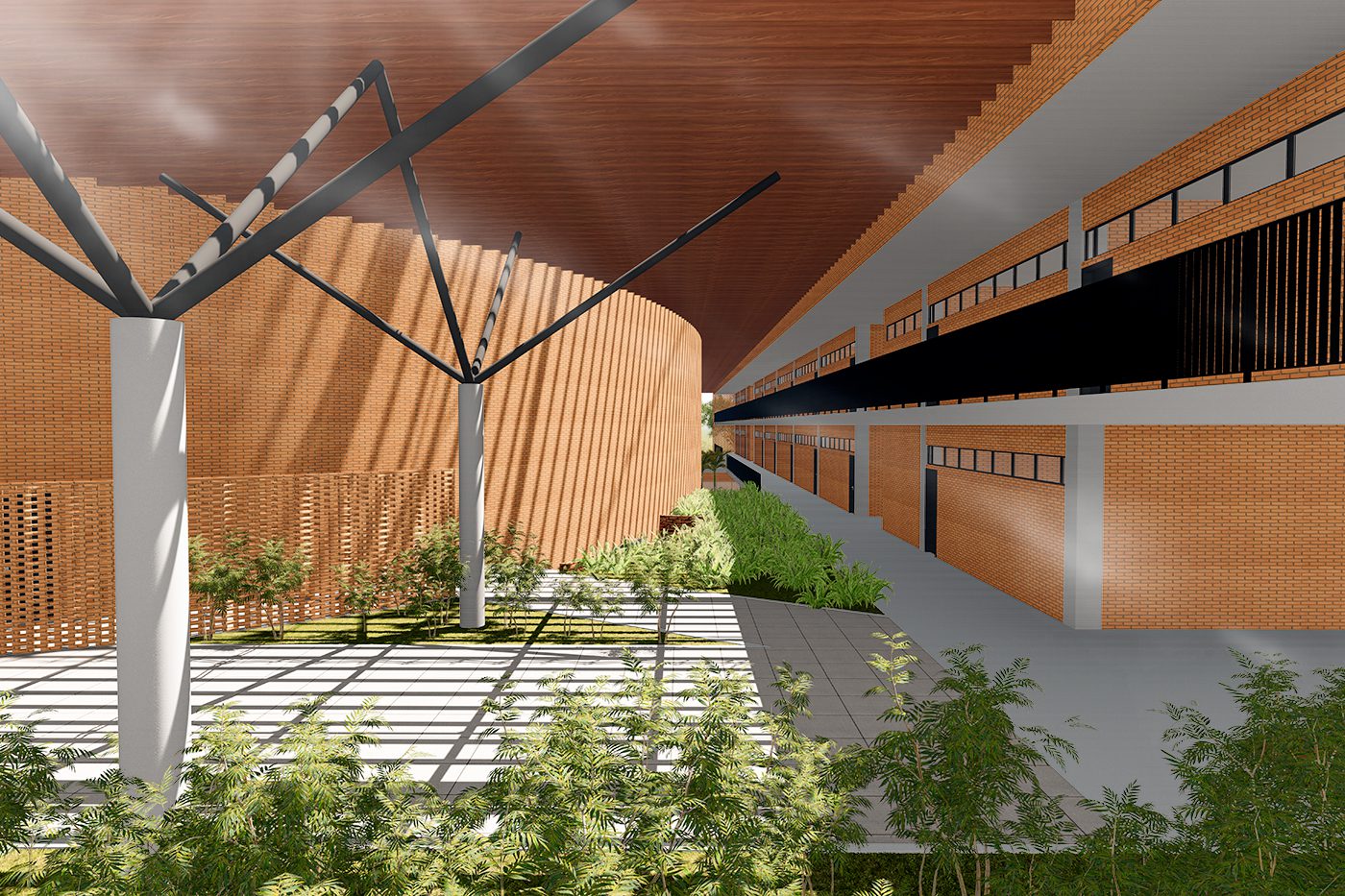 A organização espacial segue uma lógica racional. A modulação estrutural de 8 x 10 metros otimiza a execução, reduz custos e garante flexibilidade de uso ao longo do tempo, permitindo que o edifício se adapte a novas demandas e amplie sua vida útil. Entre os principais volumes, uma cobertura sombreada conecta os blocos e oferece um espaço protegido do sol, ampliando as áreas de convivência ao ar livre.