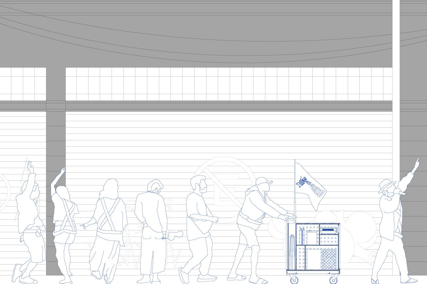 Os encontros entre as madeiras foram feitos com cantoneiras para facilitar a montagem e desmontagem. A fim de facilitar a organização dentro do carrinho, foram executados nichos, prateleiras e aberturas. As rodas são pneumáticas para resistir às adversidades da rua. Para além, na própria base de metalon encontrada, existe um suporte que possibilita a disposição de um mastro para a bandeira do Cine Fluxo.