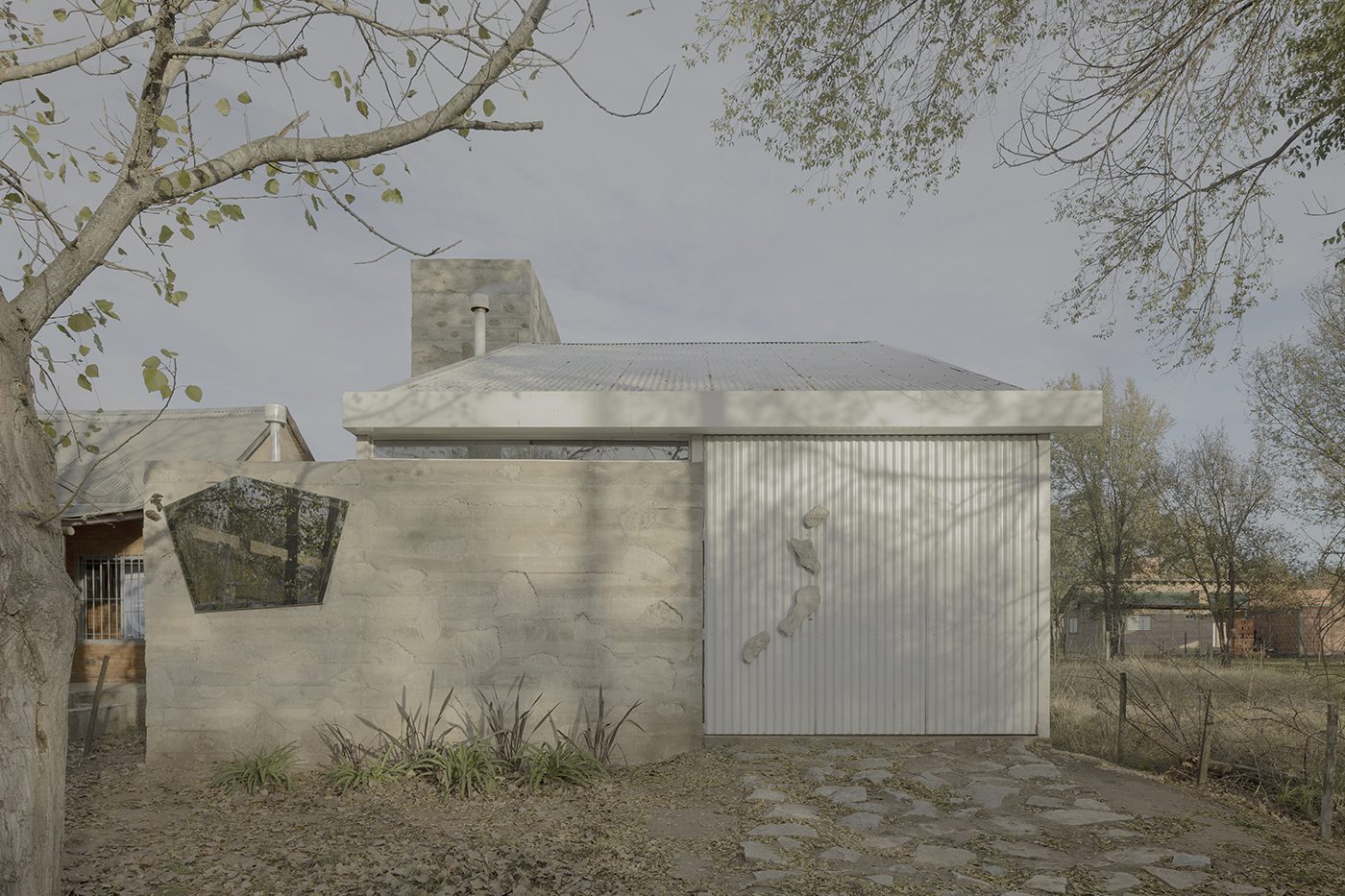 Ao sul, encontra-se o módulo de serviço construído em concreto ciclópico e de escala contida. Ele possui pedras na fachada que continuam em direção ao interior nas áreas quentes, em frente à cozinha, no centro da lareira e na parte de trás da churrasqueira. Este volume sólido tem duas perfurações irregulares e facetadas, como se fossem grandes pedras extraídas. Uma na parte posterior, que cria uma pequena varanda em direção ao jardim e a outra é um espelho que reflete uma porção da paisagem montanhosa na composição da fachada e permite observar o movimento da cidade a partir da cozinha.