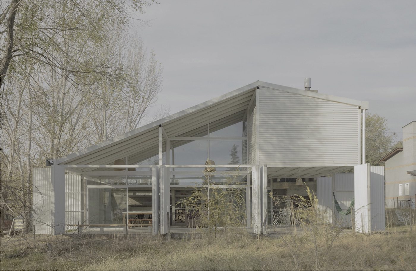 Por fim, a casa é envolta por um sistema de fechamentos móveis que cria e qualifica um espaço intermediário. As diversas configurações de abertura regulam a entrada de luz, definindo a atmosfera interna. Assim, o envoltório se torna mutável, sensível ao ambiente e ao uso. Como se trata de uma casa para finais de semana, ela permanece fechada na maior parte do tempo, ressaltando sua síntese formal.
