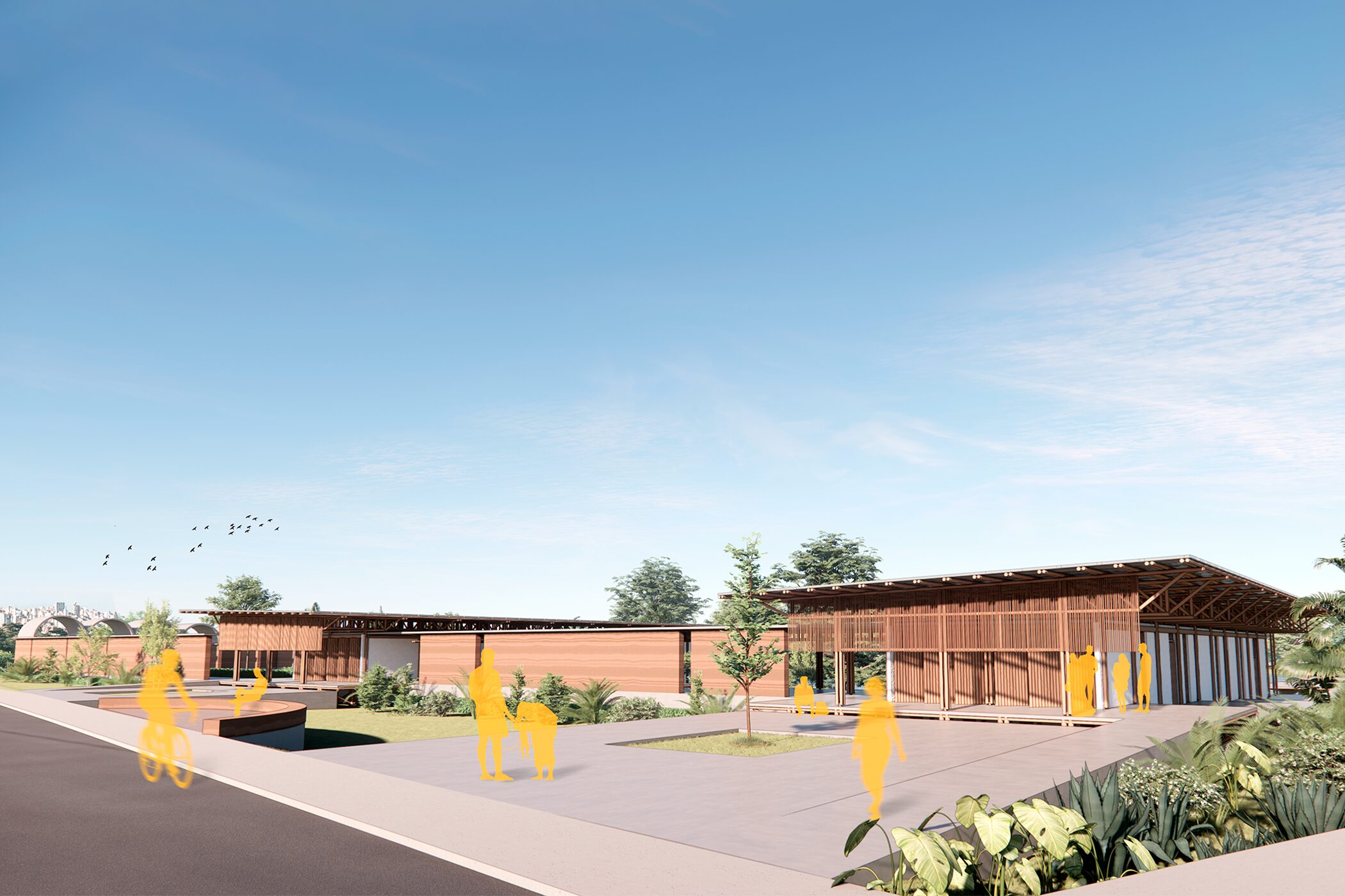 A forma do edifício segue a solução “Bota e Chapéu” (Armando de Holanda), com grandes beirais para sombra e cobertura clara. Os fechamentos leves empregam taipa de mão, resgatando um saber-fazer tradicional de baixo impacto. A cobertura em abóbada escorada por bambu (tecnologia da Arquiteta Leiko Motomura) evita materiais de alto impacto. Bambu, madeiras e barro são elevados do solo e protegidos por fundação em concreto.