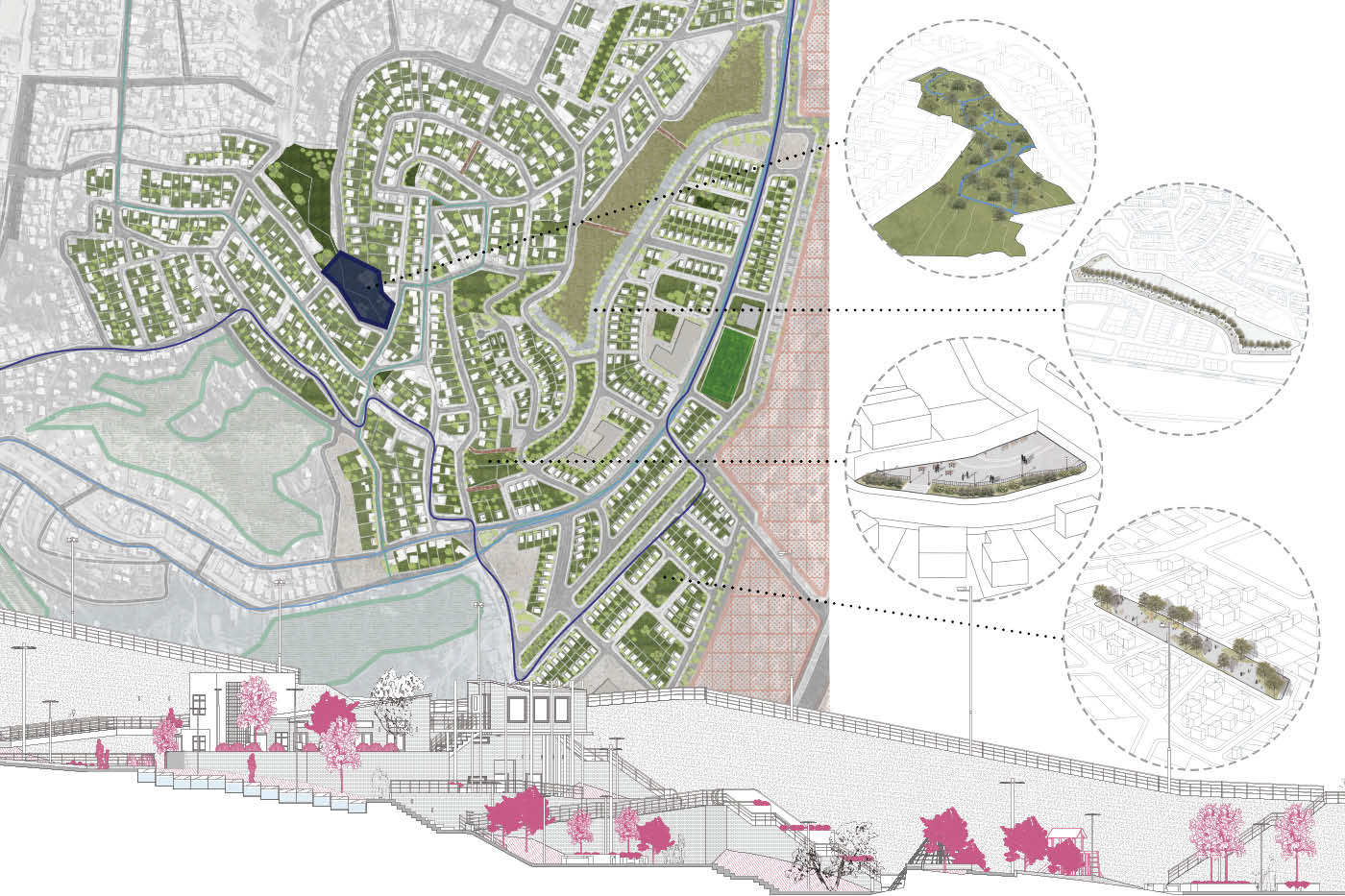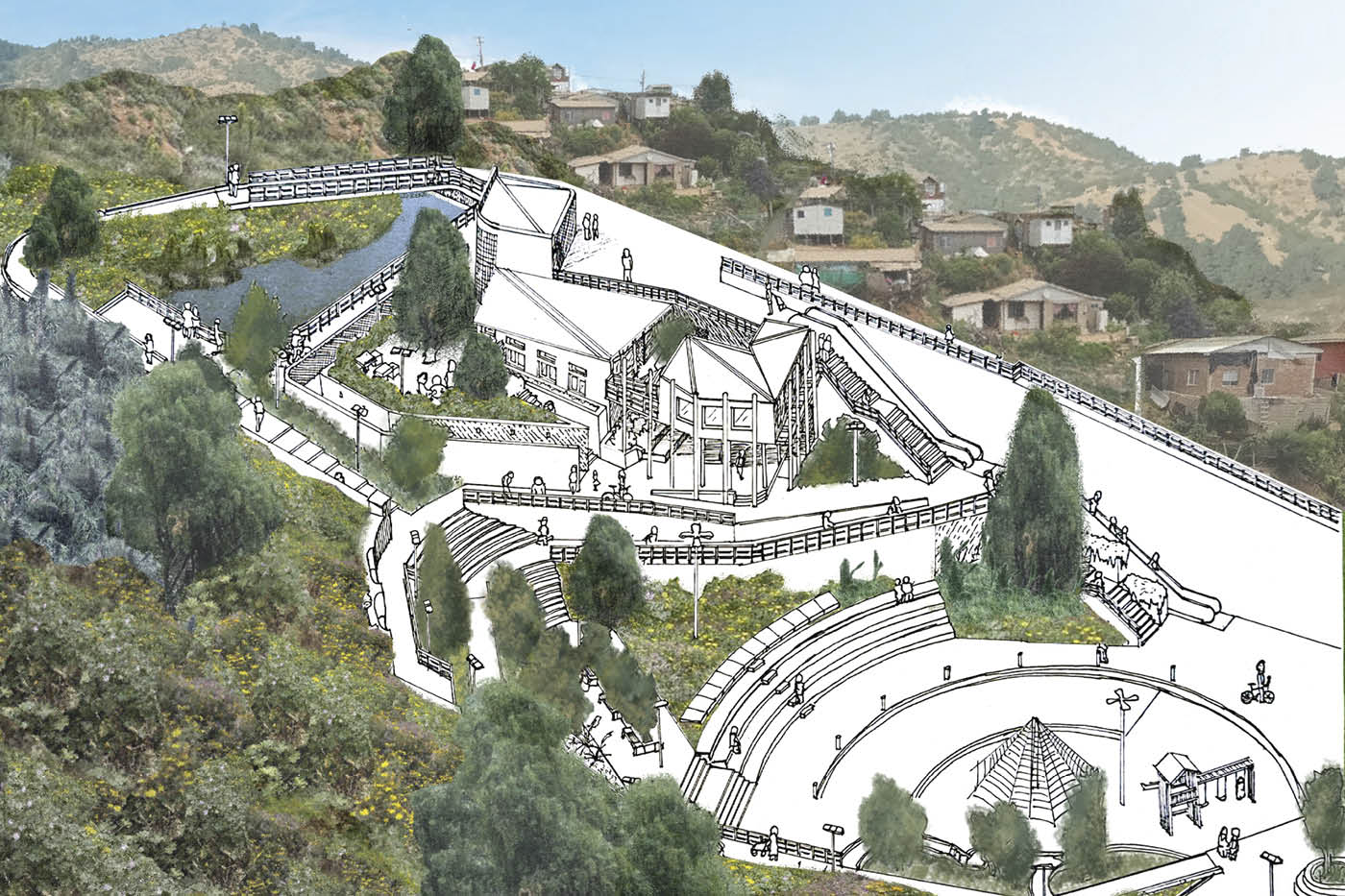 Nesse contexto, elaborou-se um masterplan coletivo, construído em oficinas participativas, percursos e observações junto à comunidade. A estratégia entende a quebrada como parque interbairros, articulando vilas por meio de infraestruturas verdes, equipamentos comunitários e corredores de proteção contra incêndios. Mais que projetar espaços, buscou-se uma mudança de olhar: compreender o campamento não apenas como assentamento informal, mas como território com direito à cidade e a um futuro sustentável.