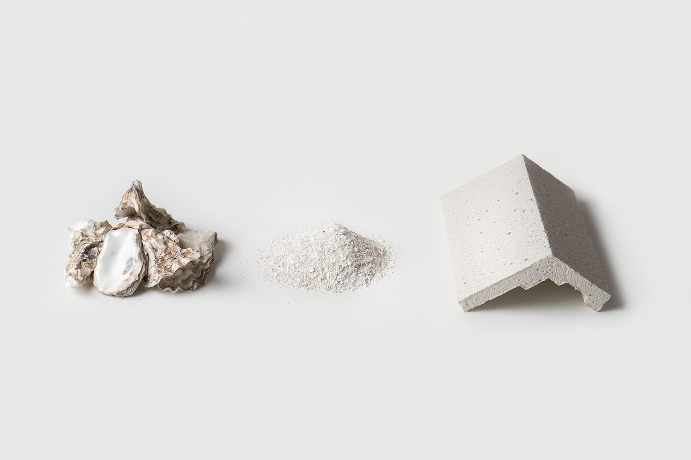 Através de protótipos, matérias-primas, componentes moldados e amostras de teste desenvolvidos durante a fase de pesquisa, o projeto fornece uma exploração aprofundada da transformação do material, de concha para ladrilho.