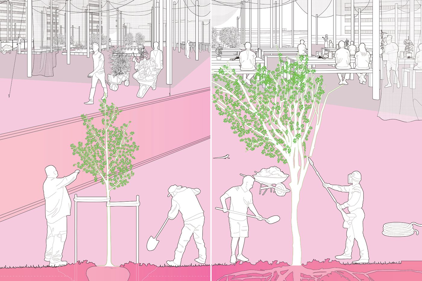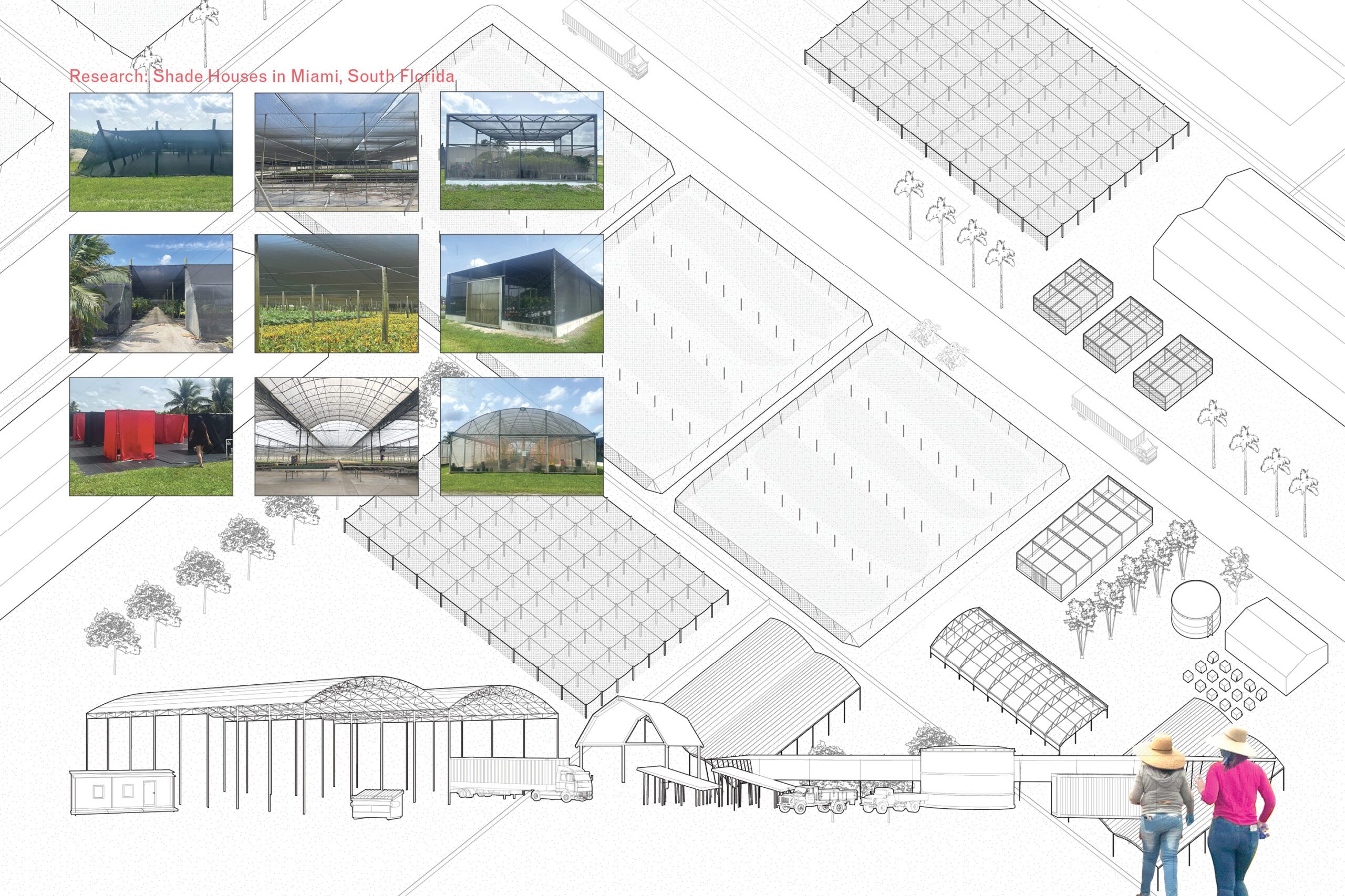 Este projeto aborda o florestamento urbano tanto como um projeto ambiental quanto socioeconômico, no qual a arquitetura pode apoiar uma cultura de cuidado recíproco entre árvores e pessoas. Ele adapta as estruturas botânicas de “casas de sombra” (shade houses), onipresentes nas áreas agrícolas e horticultoras do Sul da Flórida, para o contexto urbano. As intervenções equipam espaços públicos e residuais com a sombra temporária necessária para apoiar a manutenção das árvores e articular engajamentos comunitários. O objetivo é fornecer uma estratégia arquitetônica para programas administrados pelo governo, como a distribuição de mudas, compostagem e educação botânica, acessíveis ao público a um baixo custo.