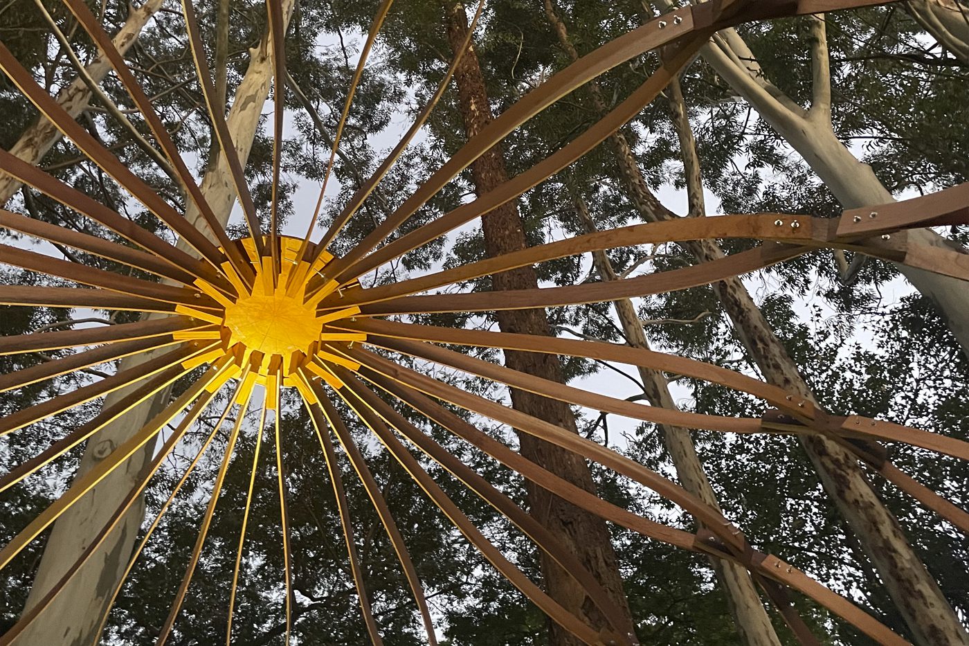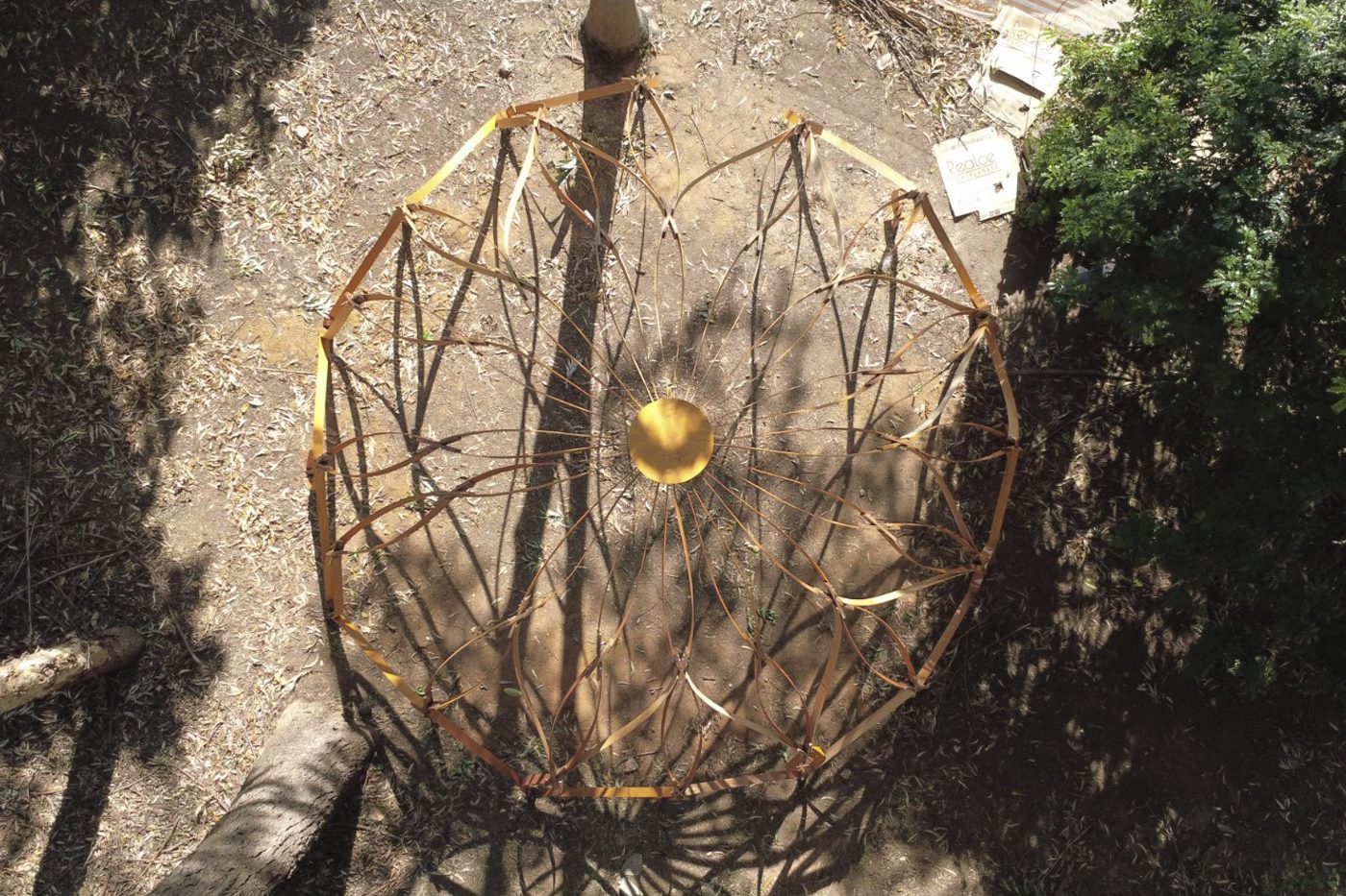 Vista de cima, a estrutura revela sua geometria radial, ripas de madeira partem de um núcleo central e se distribuem até o perímetro, formando um padrão que combina simetria e organicidade. As linhas sugerem um movimento espiralado, próximo às formas encontradas na natureza, como pétalas ou nervuras de folhas. Essa lógica construtiva garante o equilíbrio das forças, em que cada elemento trabalha em compressão e flexão, sustentado pelo todo. O domo, nesse enquadramento, se mostra não apenas como um objeto arquitetônico, mas também como um diagrama vivo da relação entre a forma e o caminho das forças.