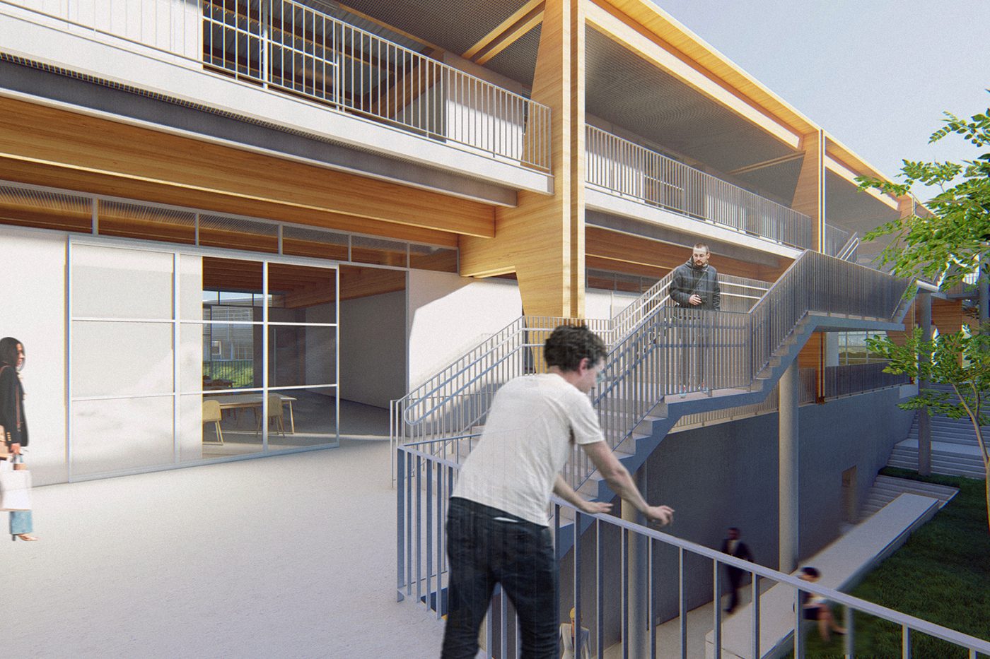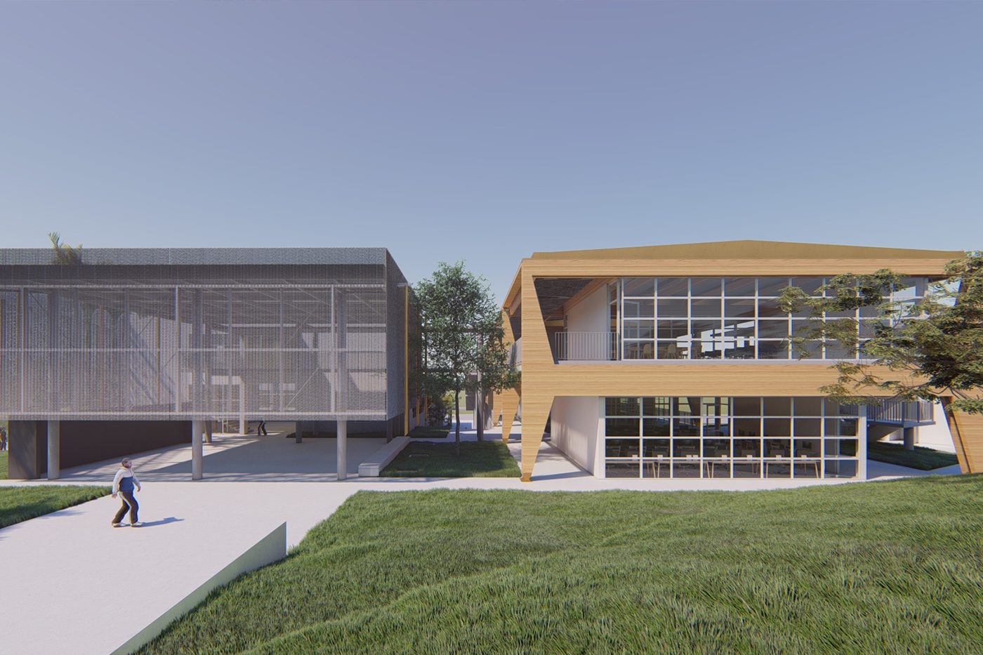Para contemplar o programa do IAU, o conjunto passa a ter três edificações independentes, conectadas por passarelas e escadas. A ideia é que os edifícios existentes e a nova construção, embora formalmente e esteticamente distintos, formem um conjunto integrado e único, no qual os espaços entre eles ganham também programa e significado, como áreas de jardim, convivência ou contemplação.