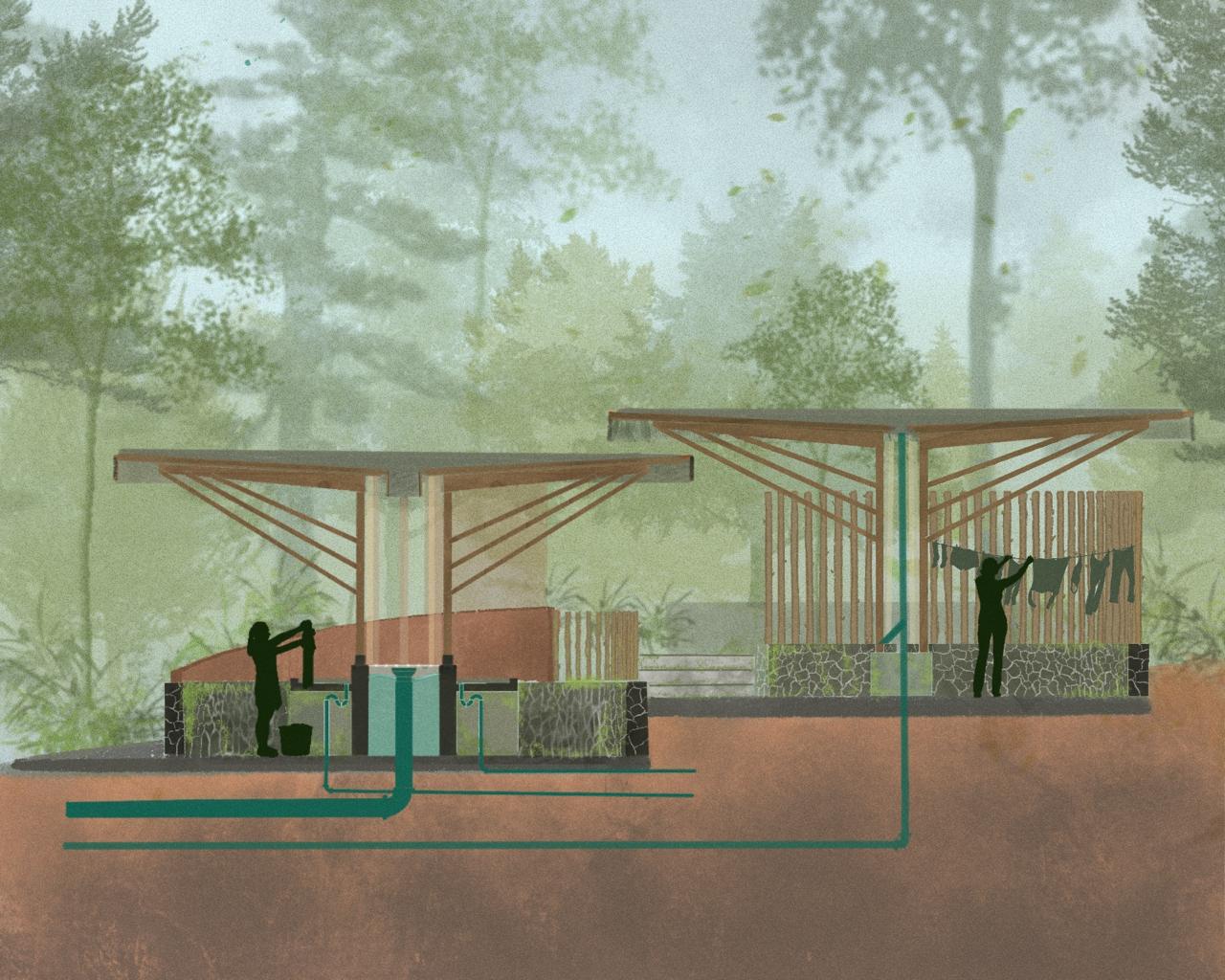 Após vários meses de trabalho, os alunos apresentaram seus projetos à comunidade, que votou em seu design preferido. O projeto vencedor teve como inspiração as vitórias-régias, biofiltros naturais, para a estrutura, dada a relação do projeto com a água e o ambiente natural ao redor. Cada espaço é desenvolvido sob sua própria estrutura individual de madeira, apoiada por uma coluna central onde o telhado age como um funil que recolhe a água e a leva para uma cisterna. Essa água é então usada pelas pessoas para lavar suas roupas e, em seguida, é direcionada para um biofiltro que a limpa, permitindo que seja reutilizada. Cada material foi escolhido levando em consideração a disponibilidade, a facilidade de construção, o impacto ambiental e o orçamento, que depende de doações feitas por pessoas que querem apoiar a causa. Este projeto em andamento representa os esforços de inúmeras pessoas, desde os professores, os alunos até a própria comunidade, mostrando como seus esforços combinados podem levar a algo que vai ainda mais longe do que eles mesmos.
