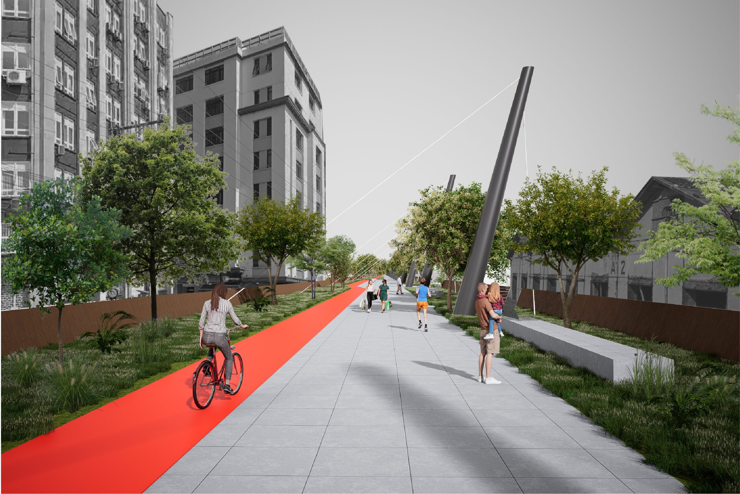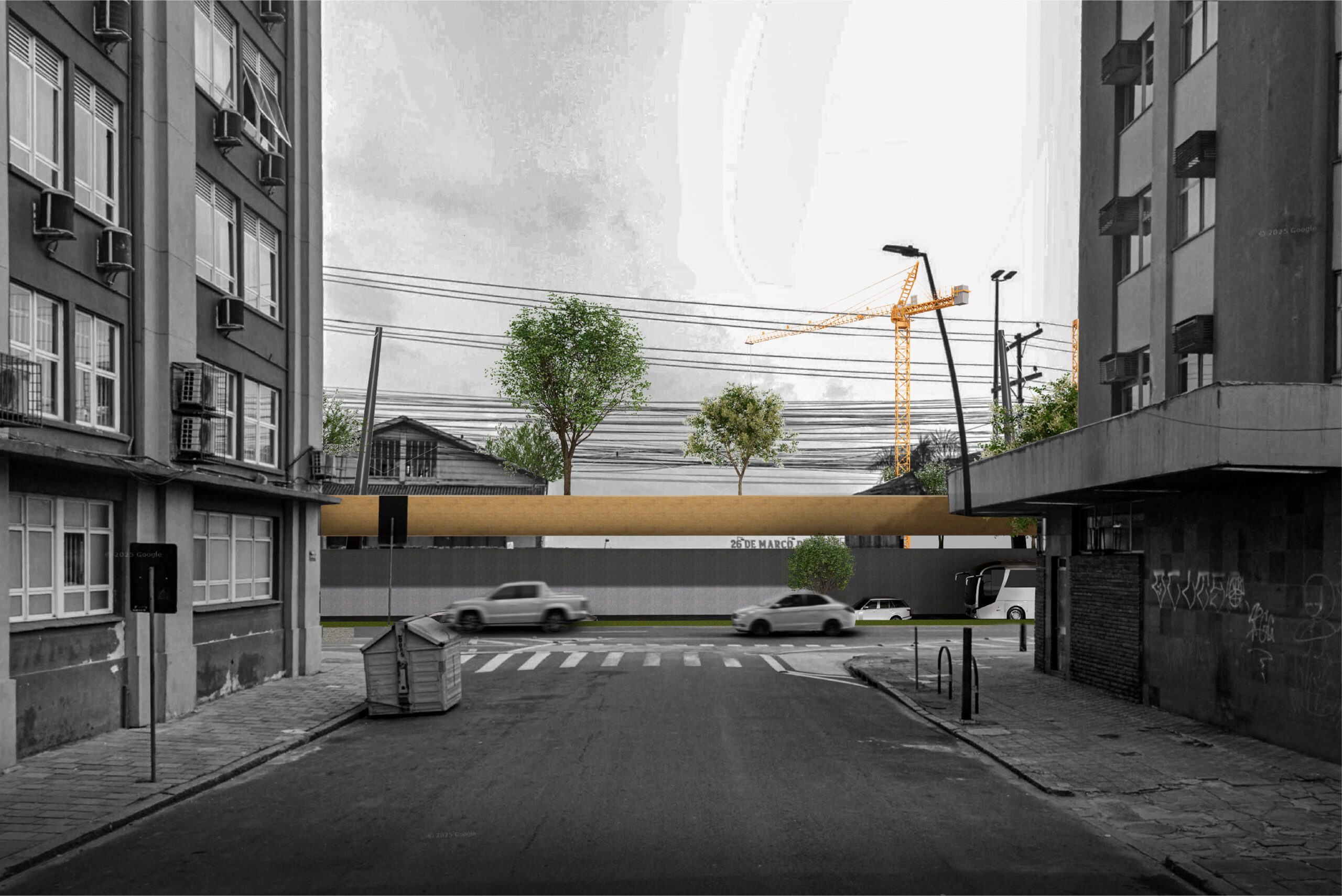 O projeto redesenha essa borda rígida como espaço de encontro, circulação e permanência. Um passeio elevado conecta o Centro Histórico ao Cais Mauá, devolvendo protagonismo ao pedestre e oferecendo espaços de lazer, contemplação e mobilidade ativa. Faixas verdes e ciclovias percorrem o traçado, auxiliando na drenagem urbana e trazendo conforto ambiental, enquanto os galpões do cais são reativados como polos culturais, gastronômicos e comunitários.