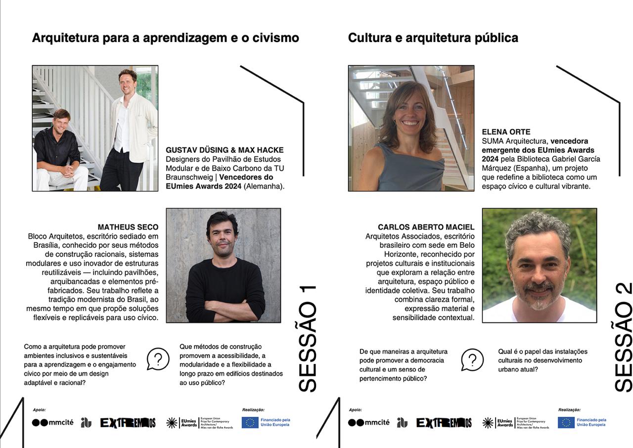 Bloco Arquitetos, escritório sediado em Brasília conhecido por seus métodos construtivos racionais, sistemas modulares e uso inovador de estruturas reutilizáveis — incluindo pavilhões, stands e elementos pré-fabricados. Seu trabalho reflete a tradição modernista brasileira ao mesmo tempo que propõe soluções flexíveis e replicáveis para uso cívico.