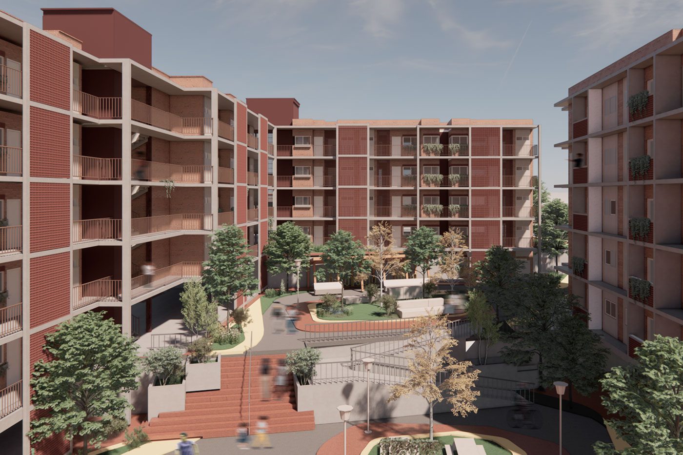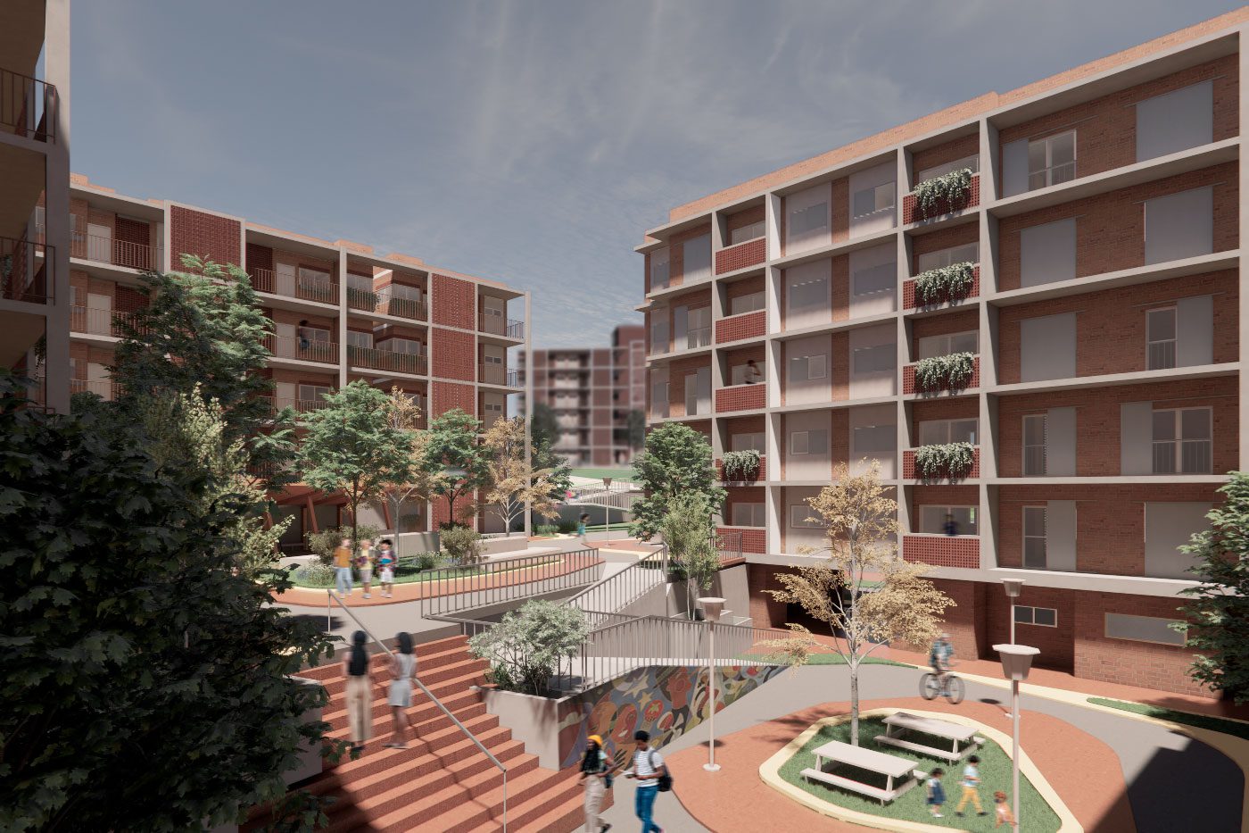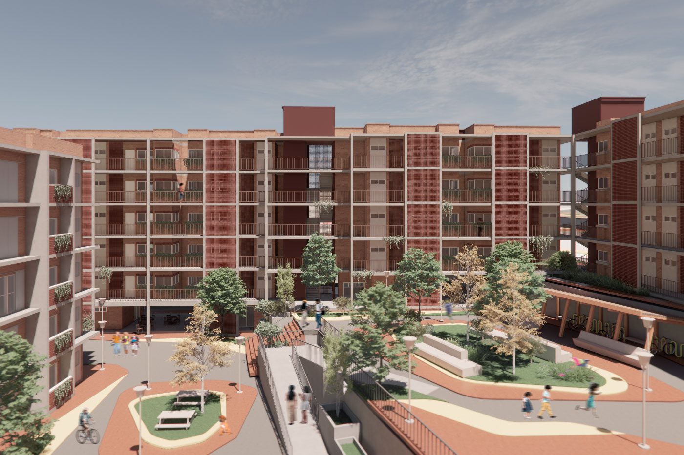 O projeto Habitar Mandela teve início no apoio à comunidade Nelson Mandela em Campinas-SP, que sofreu violento despejo mesmo ocupando área que não cumpre função social há mais de 20 anos. Após mobilização e negociação, a comunidade conquistou o direito à moradia. Contudo, a prefeitura e Cohab Campinas condicionou o financiamento a lotes de 90m2 e embrião sanitário de 15m2, iniciativa em total desacordo com o conceito de moradia digna. Assim, para a área adjacente ao residencial construído pela prefeitura, foi desenvolvida esta proposta de Moradia Social visando a mitigação e adaptação aos efeitos das mudanças climáticas e combate à injustiça e racismo ambiental. Prevê diversas praças, espaços verdes abertos, canteiros e jardins. A introdução de vegetação nativa nesses espaços fortalece os ecossistemas locais, ajuda na drenagem, melhora a qualidade do ar e das águas do córrego e também atua como ferramenta para a captura de carbono da atmosfera, sendo um ativo contra ilhas de calor. Foram integradas Soluções baseadas na Natureza para aprimorar a drenagem, reduzir impactos ambientais e melhorar a qualidade de vida dos moradores, trabalhando a favor do ciclo hidrológico. Houve intenso cuidado no desenho do traçado urbano de forma a conter volumes maiores de águas pluviais e a velocidade das águas devido à alta declividade da área. Biovaletas foram implementadas ao longo das ruas para captar e infiltrar a água da chuva no solo, evitando alagamentos e minimizando a erosão. Próximo às unidades habitacionais, jardins de chuva auxiliam na absorção da água pluvial, além de contribuir para um ambiente mais fresco e agradável. Para conter volumes maiores de água, bacias de retenção foram projetadas para armazenar temporariamente o excedente hídrico, liberando gradativamente e evitando sobrecargas no sistema de drenagem. Tais estratégias também foram vinculadas à tipologia e Implantação do conjunto de edifícios de Habitação Social, uma vez que um melhor adensamento permite otimização de materiais construtivos e liberação de solo para áreas livres para praças, áreas de lazer e recreação. O adensamento contribui para o não espraiamento desnecessário de áreas periurbanas e, consequentemente, melhor integração e cobertura dos modais de transporte, valorizando a mobilidade ativa. Os apartamentos são projetados para serem adaptáveis, permitindo atender famílias de diferentes perfis, além das tipologias completamente acessíveis para pessoas PCD. Houve grande atenção para o conforto ambiental das unidades, especialmente a ventilação e orientação solar, colaborando ainda para um morar mais saudável. A opção da materialidade do bloco cerâmico, produzido na região, reforça a identidade e o pertencimento das famílias, ao mesmo tempo que diminui sua pegada ambiental. Para os programas das áreas e equipamentos coletivos, foi considerada a apropriação existente dos moradores, suas demandas e as características ambientais do contexto que implicaram em programas como a praça da pipa, a sede da comunidade; a parede de escalada; as áreas de hortas e pomares, dentre outros. O fortalecimento do vínculo com as comunidades vizinhas foi um dos pilares para a implantação das unidades habitacionais, serviços, equipamentos e áreas de lazer, destacando-se a proposta da ponte de ligação sobre o corrego que elimina o isolamento, ao mesmo tempo que valoriza as áreas de preservação e de proteção ambiental.