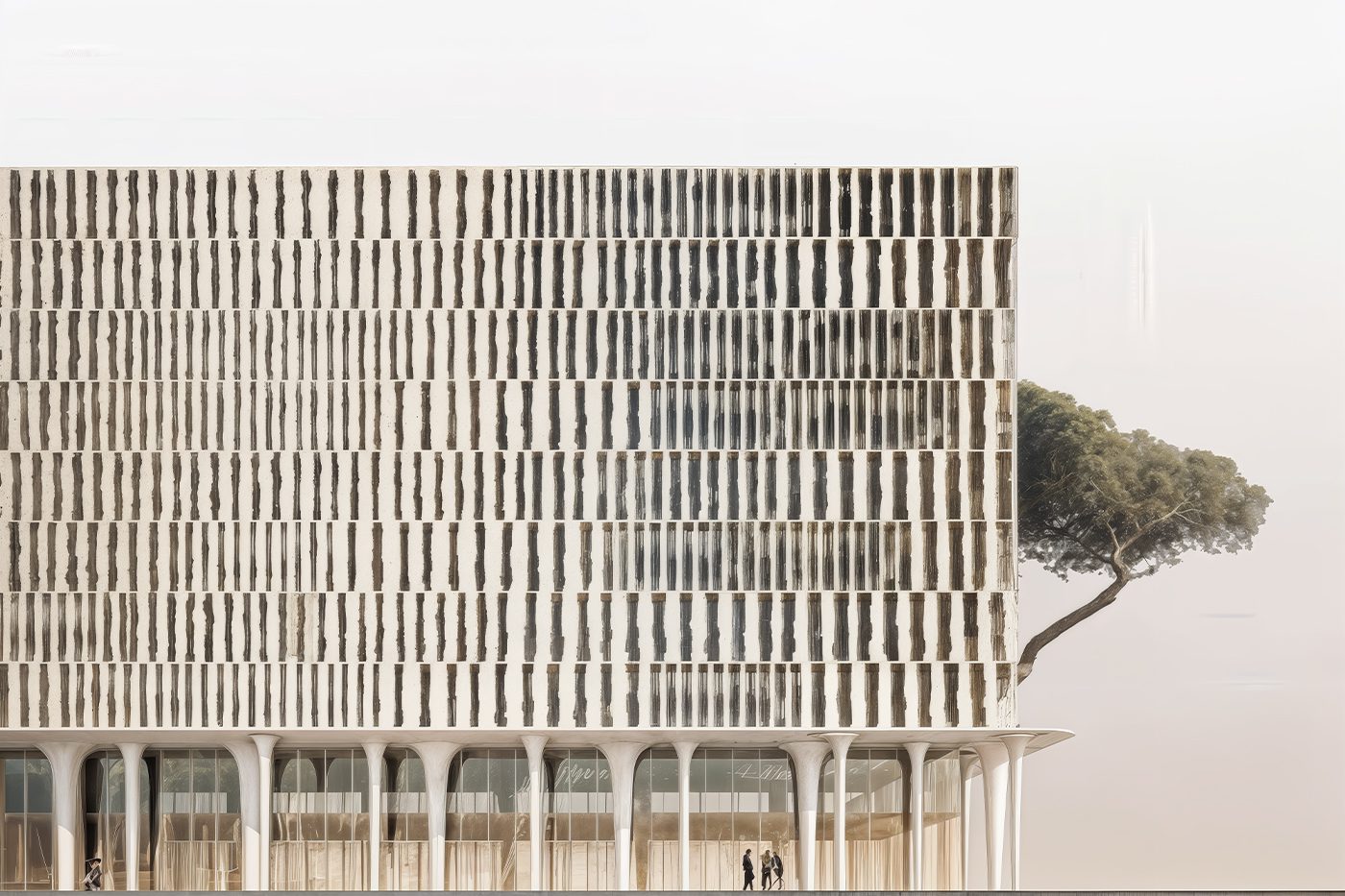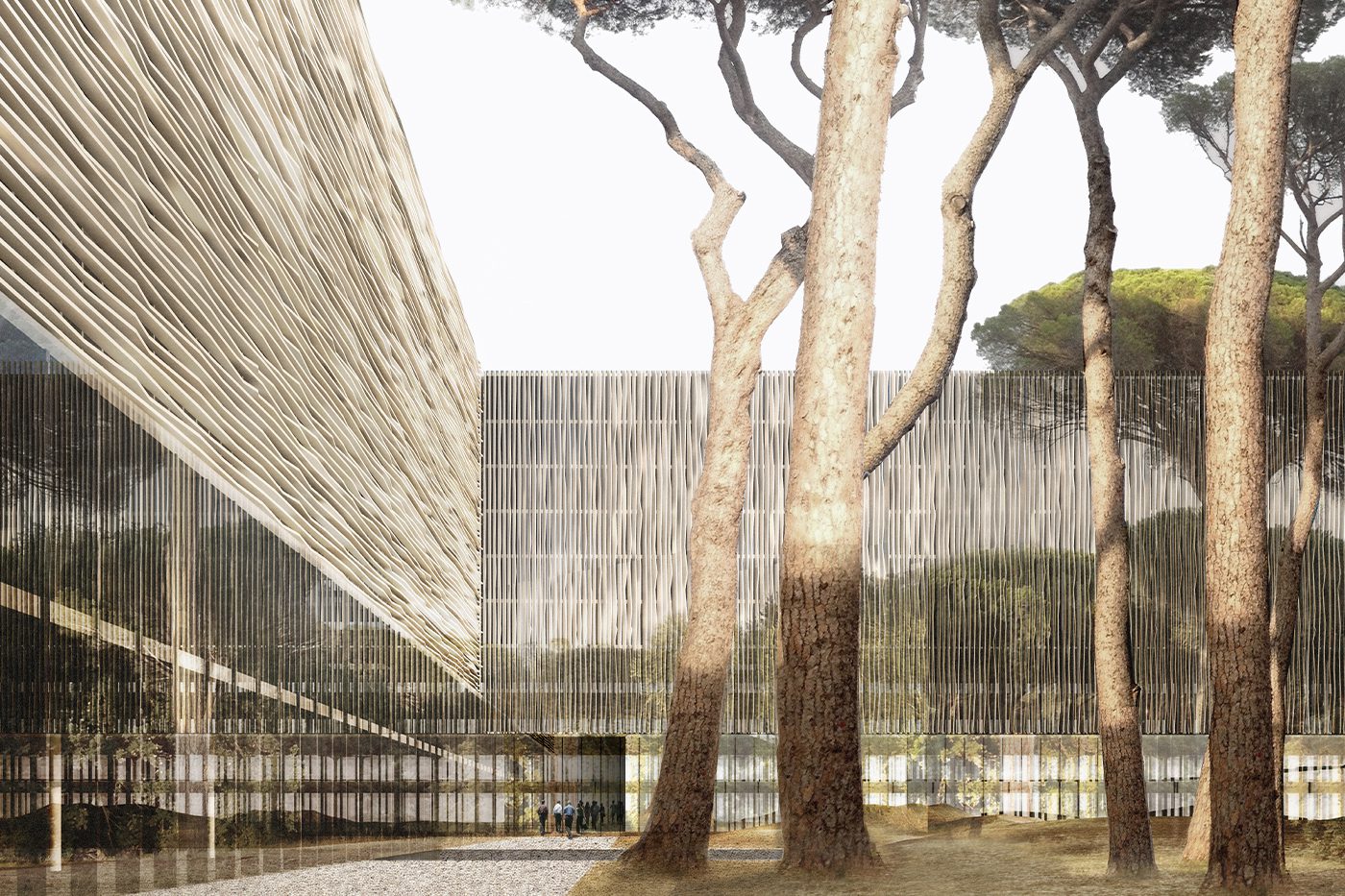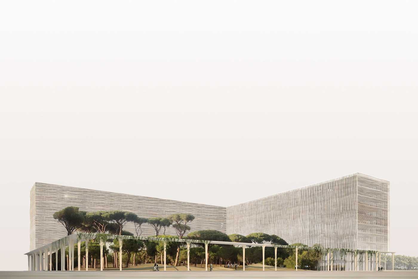 A sede do ISTAT é um projeto fundamentado em escolhas éticas, estratégicas, econômicas e funcionais, com foco na eficiência do espaço e dos recursos. Ao otimizar o projeto, reduz os custos de construção em aproximadamente 6,5 milhões de euros em comparação com o orçamento do concurso, assegurando, no entanto, alto desempenho, longa durabilidade e uma imagem institucional representativa. O edifício é um volume em forma de L de 38.000 m² projetado para acomodar 2.000 usuários, inserido em um parque público de 8.100 m² que inclui um espelho d’água e percursos esportivos. O travertino local, aplicado como brise-soleil nas fachadas sul, leste e oeste e como revestimento ventilado ao norte, dialoga com a luz natural e evoca a memória coletiva de Roma. A planta otimizada do edifício minimiza a área útil e os custos, permitindo o reinvestimento das economias em medidas avançadas de eficiência energética e ambiental, incluindo envoltórias ventiladas, vidros fotocrômicos e fotovoltaicos, átrios bioclimáticos, sistemas de captação de água da chuva e coberturas verdes. Os interiores são flexíveis, cheios de luz natural e promovem o bem-estar organizacional, oferecendo vistas desimpedidas para a vegetação e numerosas áreas comuns. Átrios e varandas ajardinadas criam espaços convidativos de break-out, melhorando o conforto térmico e a qualidade do ar interior. Além da excelência funcional, o projeto contribui para a cidade com uma generosa paisagem: um bosque público de pinheiros-marítimos implantado em um terreno suavemente ondulado, fresco e abrigado, proporcionando um valor ambiental e social duradouro para o contexto urbano.