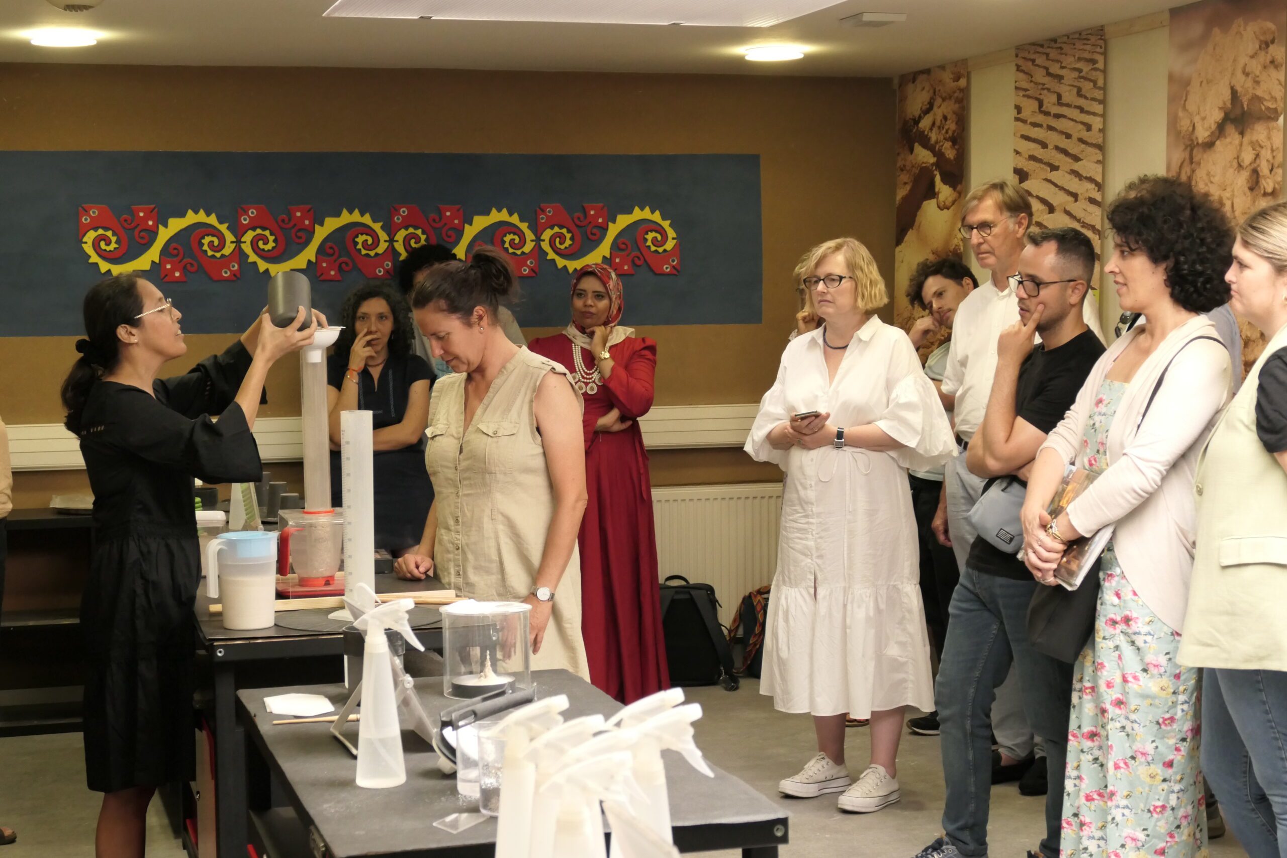 Por meio de 13 experimentos, vários elementos que compõem a terra são manipulados e, às vezes, misturados para entender as interações que se operam durante os processos construtivos. Por meio desses experimentos com materiais, a oficina nos ajuda a compreender o comportamento surpreendente da matéria em grãos, o papel da argila e da água, e a responder a uma pergunta fundamental: como transformar uma matéria-prima em um material de construção sustentável — e como isso se sustenta?