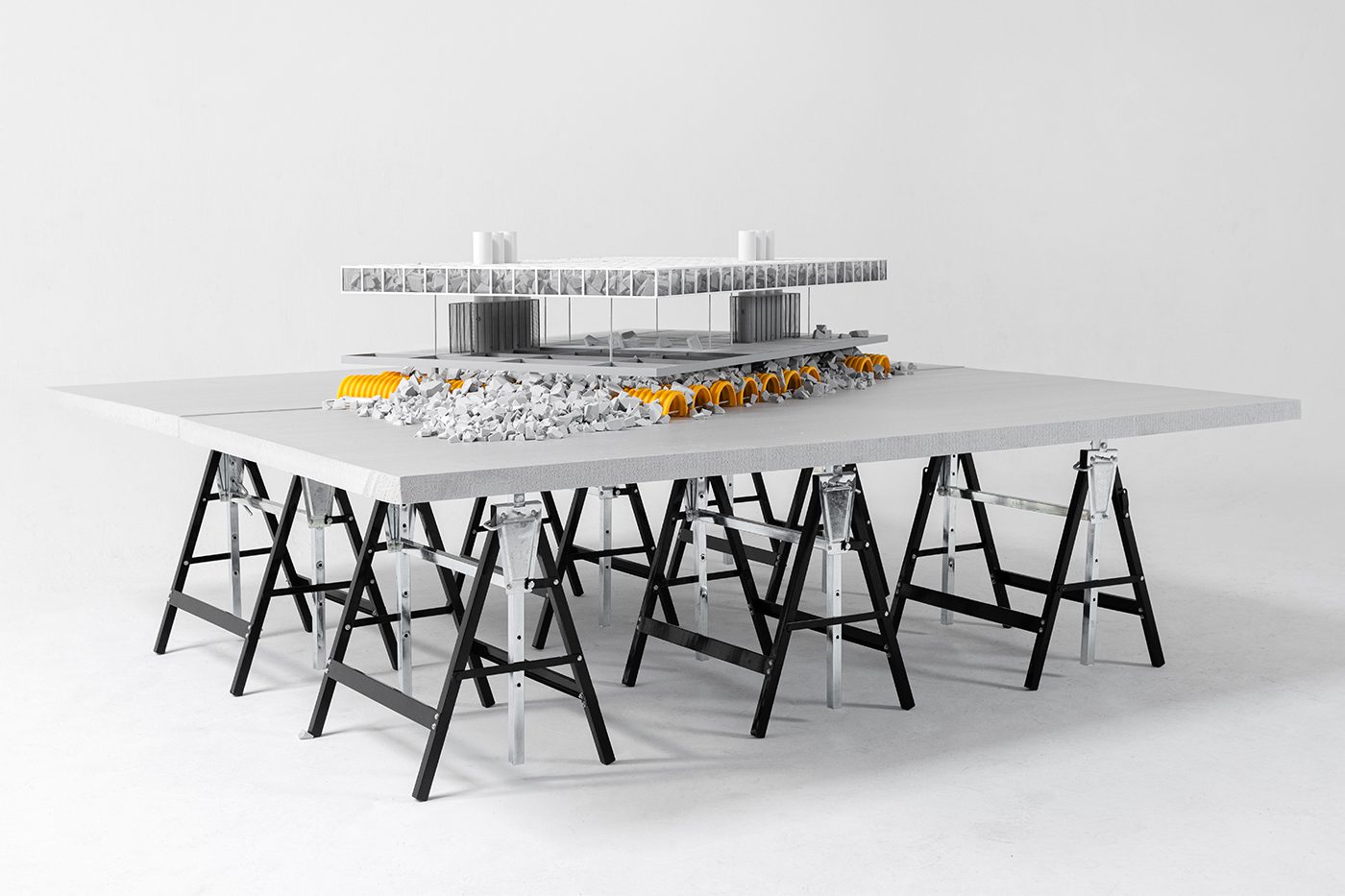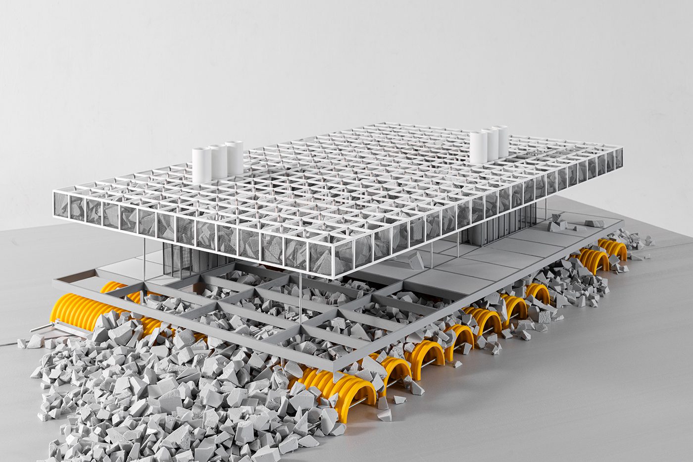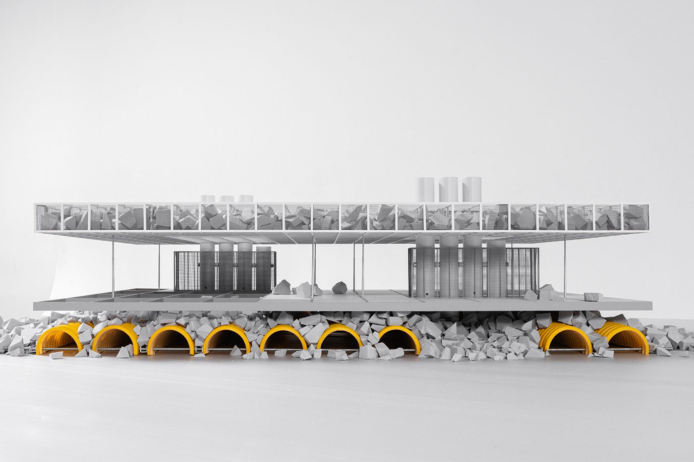 Este centro de resfriamento não apenas amplia a capacidade de detenção de água on-site, mas também propõe como as infraestruturas climáticas podem funcionar para além do mero abrigo. OPEN-GROUND oferece o posicionamento político de que o papel da arquitetura no Antropoceno é hibridizar a relação entre a vida pública e os sistemas terrestres. A parte inferior do projeto, composta por tubos e condutos, vigas cruzadas e substratos do solo, imagina a arquitetura como parte de uma pilha planetária, mediando as geologias, hidrologias e atmosferas de um lugar para oferecer um novo espaço para reuniões sob o sol.