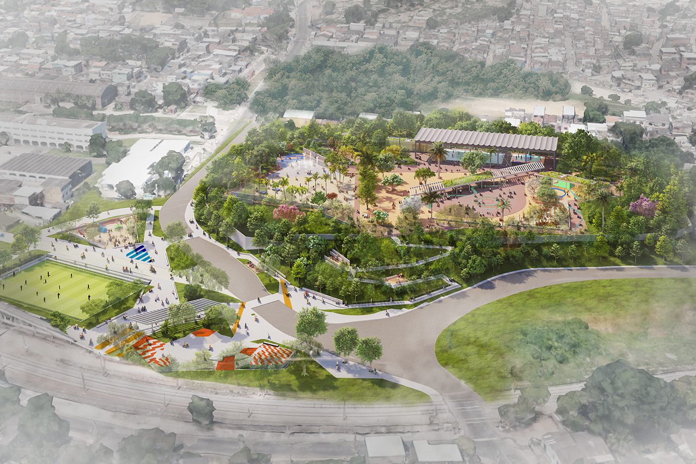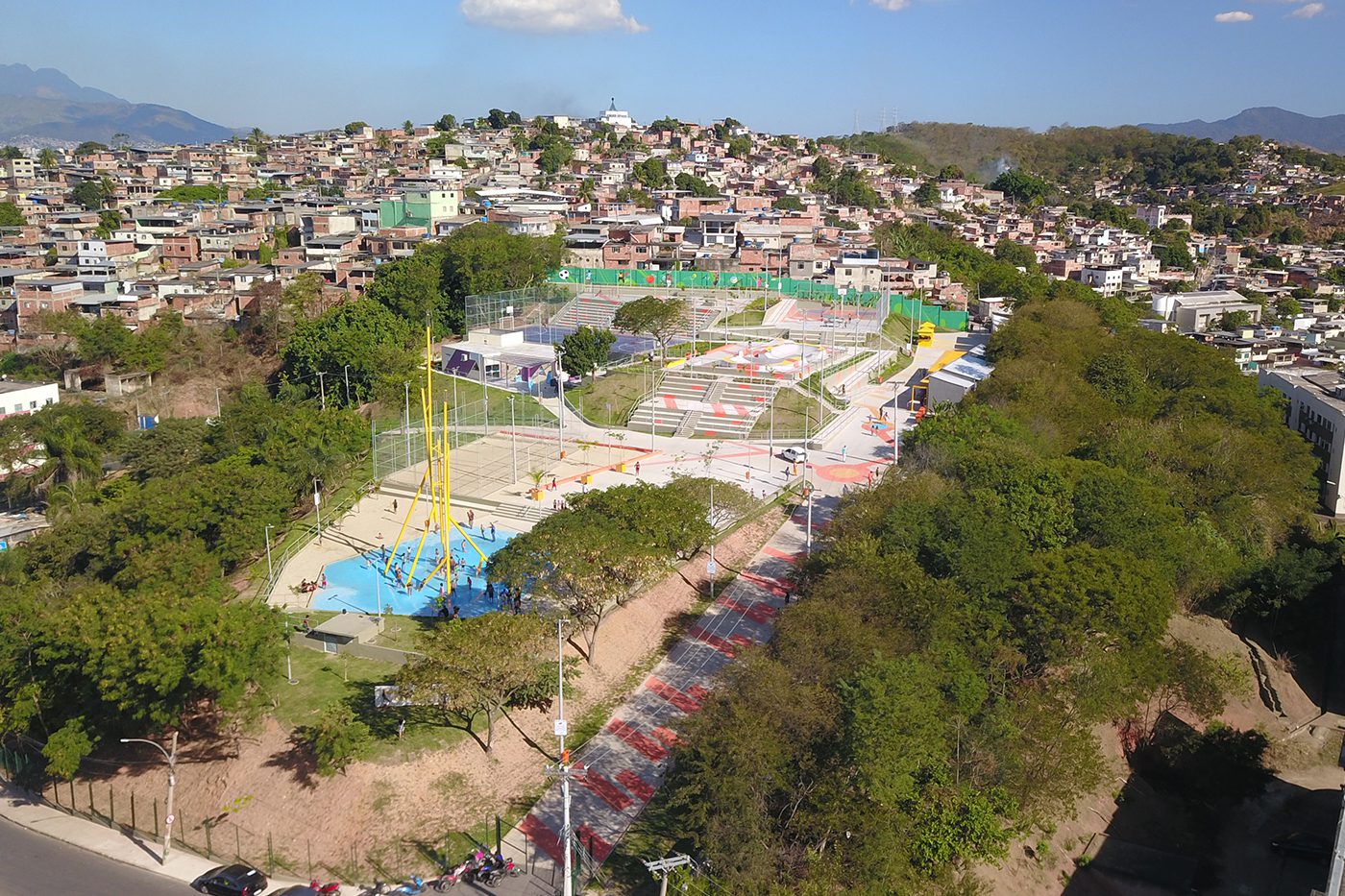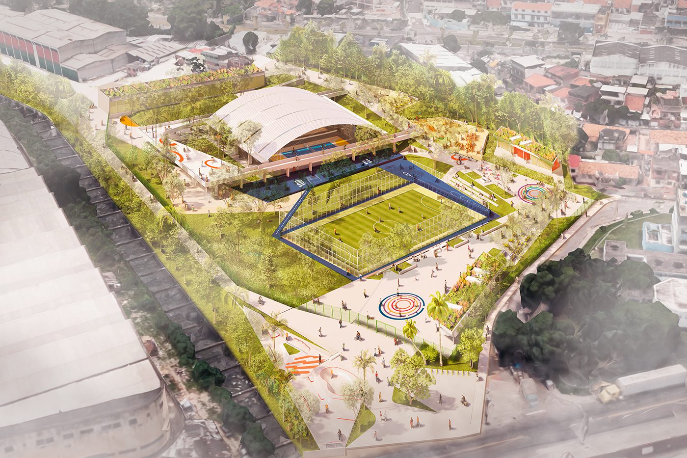 No Parque Carioca Pavuna, uma escultura de 22 metros de altura evoca as raízes do manguezal, de onde jorram jatos d’água durante o dia e feixes de luz à noite. Adjacentes à área molhada, superfícies de areia reinterpretam os usos da paisagem litorânea, já tão querida pelos cariocas. No Parque Inhaúma, às margens do Rio Timbó, extensos jardins drenantes auxiliam na detenção e infiltração das águas para mitigar alagamentos em eventos climáticos extremos. No Parque Costa Barros, o programa esportivo se expande para espaços residuais do entorno imediato, transformando em borda porosa uma fronteira que hoje é intransponível.
