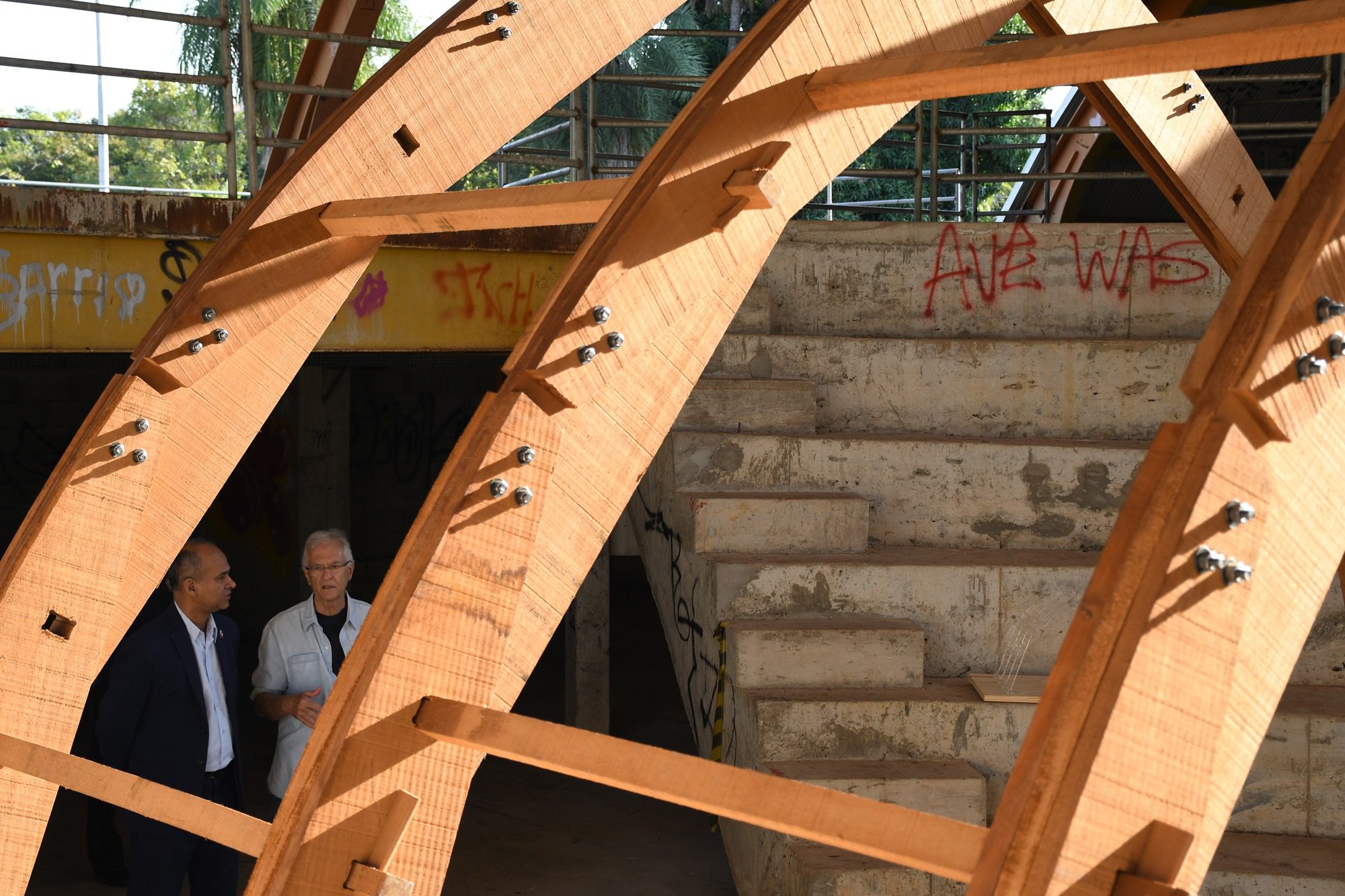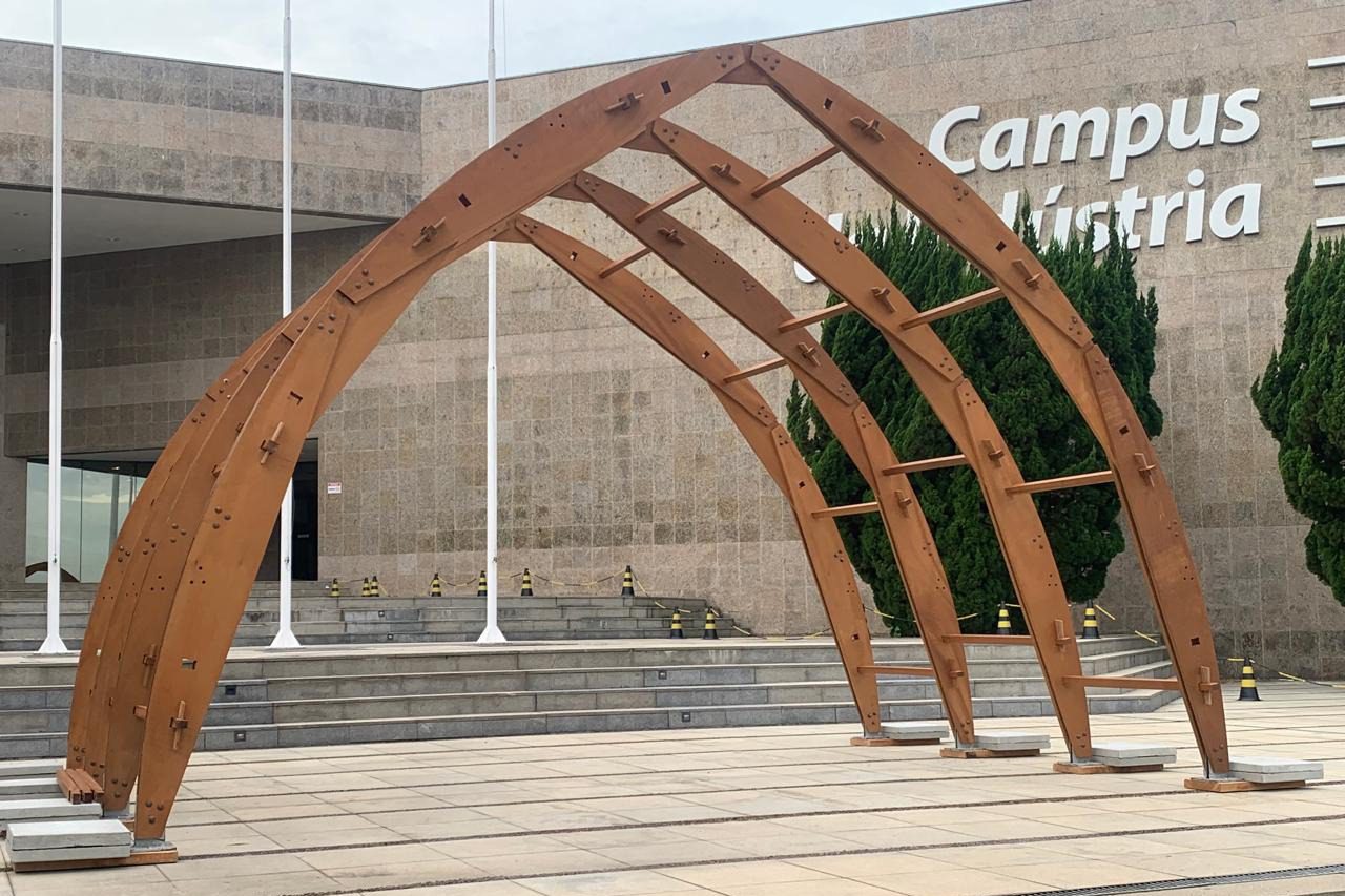 Conjuntos de peças, ligadas através de parafusos e dispostas lado a lado, formam o pórtico estrutural que será repetido a cada 1,25 metros.