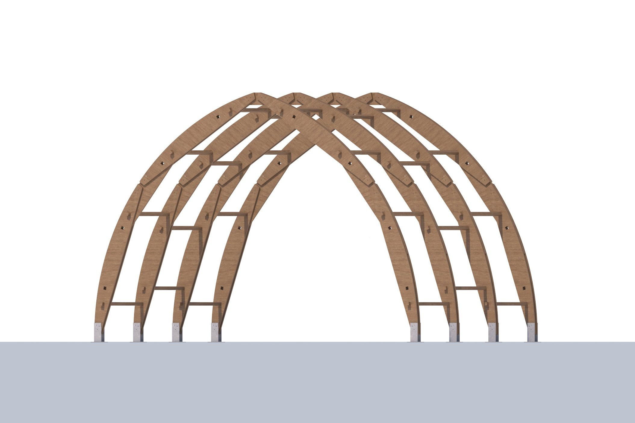 O sistema apresentado estabelece o desenho de uma peça módulo de madeira, recortada a partir de tábuas com bitolas comerciais. O posicionamento das peças obedece a uma sequência que dá forma a um arco do tipo ogival, onde as duas partes do arco são montadas de modo a que cada parte seja constituída de cinco peças módulos, executadas em sequência.
