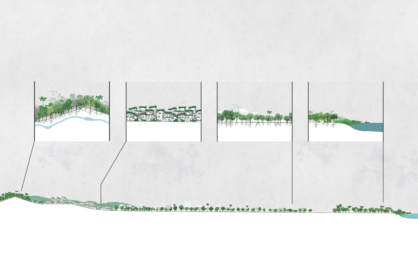 O trecho detalhado da tipologia Bairro Verde desenvolve sobre a questão dos rios urbanos, trazendo a Mata Atlântica para a cidade e detalhando as escolhas de espécies nativas com base nas histórias afetivas locais e na fauna. Com isso, o projeto se inspira na própria Penha, seus atores, seus relatos afetivos e na natureza para enfrentar a adaptação climática no Rio de Janeiro.