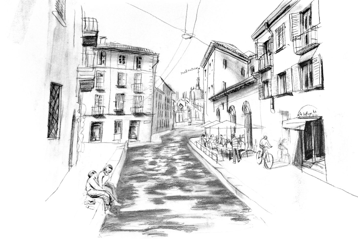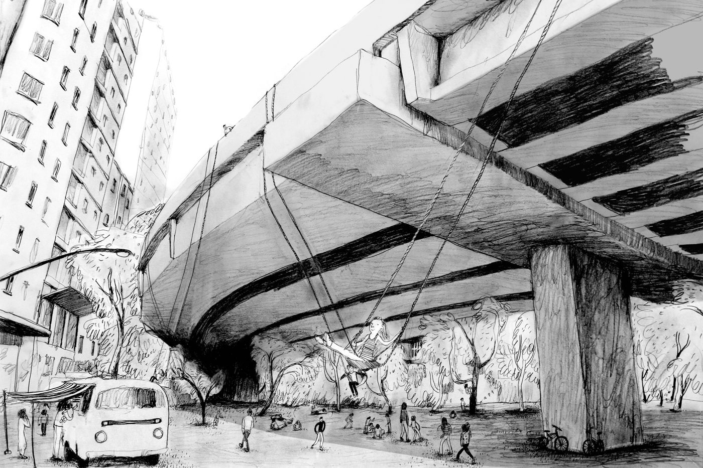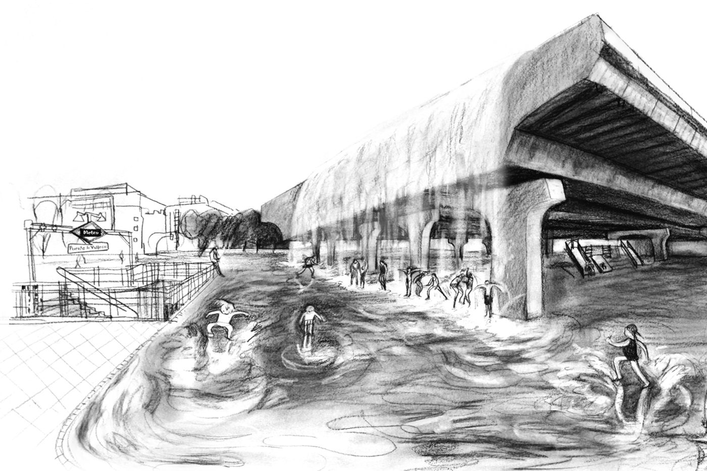 Os desenhos expostos funcionam como esboços para chamar a atenção sobre os eixos temáticos da Bienal. Para “Preservar as florestas e reflorestar as cidades”, tem que garantir as condições optimas para a sobrevivência das mamangavas, os sabiás, assim como outros polinizadores, o que passa por cuidar da vegetação existente. Embora a presença de água tenha sido decisiva para a fundação das cidades, no desenvolvimento destas temos esquecido da sua importância. Não podemos “Conviver com as águas” sem saber que existem, por isso se expõe um mapa de cada uma das cidades com seus cursos d’agua e infraestruturas desenvolvidas e depois soterradas e esquecidas. “Reformar mais e construir verde” implica preservar o patrimônio arquitetônico de predios populares com valor histórico como o neomudejar ou transformar pátios internos em jardins com água onde se refrescar no verão para “Garantir a justiça climática”. Mas também transformar o Minhocão ou o Puente de Vallecas. Ambos são exemplos muito similares de grandes infraestruturas pensadas para o carro na década dos 70 que atuam como fronteiras físicas, acentuam a desigualdade entre bairros e cujos problemas associados tem movilizado a vizinhança por anos. No projeto, em lugar de optar pela demolição total, se apresentam modificadas com o objetivo de ressignificá-las valorizando os enormes recursos materiais que foram investidos na sua construção, mas também sua potencia simbólica, como monumento ao passado adaptado as necessidades do futuro.