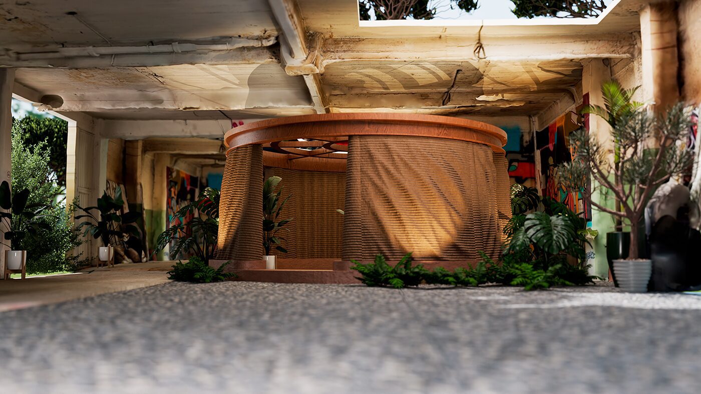 TEMIS ergue-se como um círculo de terra e tempo, o primeiro edifício autoportante de impressão 3D em terra na América Latina. Construído na Cidade do México com uma CRANE WASP, sua forma circular nasce do movimento de um braço robótico que, em 360 graus, desenha um espaço social habitável e, ao mesmo tempo, um pavilhão experimental de encontro e reflexão coletiva. Sua fachada paramétrica leva a terra ao limite: linhas que se expandem além do perímetro base, criando um movimento que responde à luz e projeta sombras em constante transformação. Cada quadrante do edifício oferece uma experiência distinta, revelando o diálogo entre tecnologia digital e matéria ancestral.