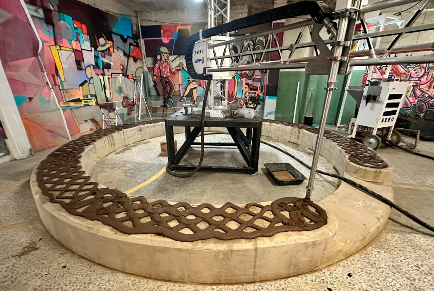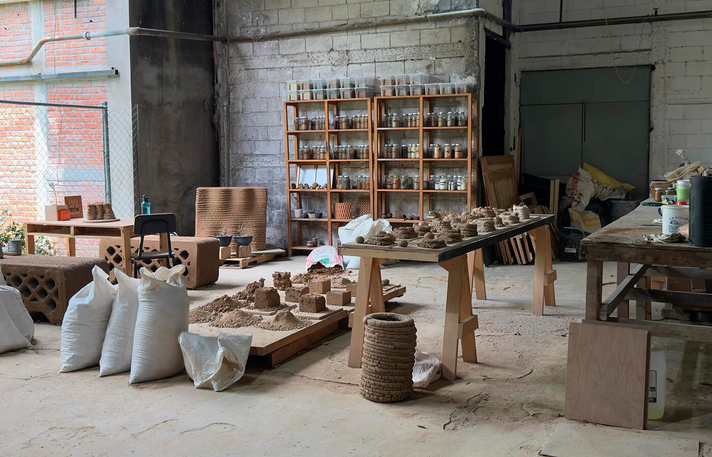 O desenvolvimento da mistura foi um dos maiores desafios do projeto. O material precisava alcançar um estado intermediário entre viscoso e plástico: suficientemente fluido para ser extrudado pela impressora, mas estável para sustentar o peso das camadas subsequentes. A formulação definitiva utilizou uma granulometria fina-média, incorporando fibras pequenas e areias para melhorar a graduação. Trabalhou-se com uma terra local arenosa, com argilas e siltes, que ofereceu a coesão necessária, sempre controlando o percentual de água: o excesso poderia comprometer a resistência e aumentar a retração.