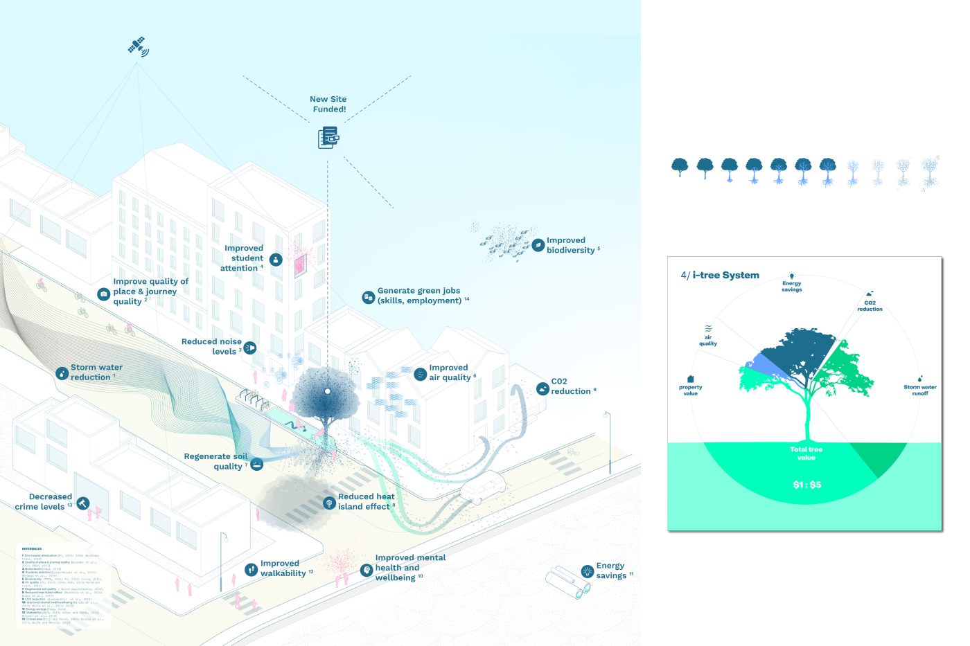 A proposta da TreesAI vai além da visão tradicional do investimento em natureza. Em vez de se restringir à compensação de carbono, a TreesAI foca nos inúmeros co-benefícios que a natureza oferece às cidades. Esses benefícios incluem regulação térmica, gestão de águas pluviais, melhoria da qualidade do ar, além de contribuir com a saúde pública e o bem-estar social. Ao focar nesses múltiplos valores, a TreesAI propõe repensar o valor da natureza no planejamento urbano, criando modelos de financiamento que reconheçam o impacto de longo prazo das soluções baseadas na natureza.