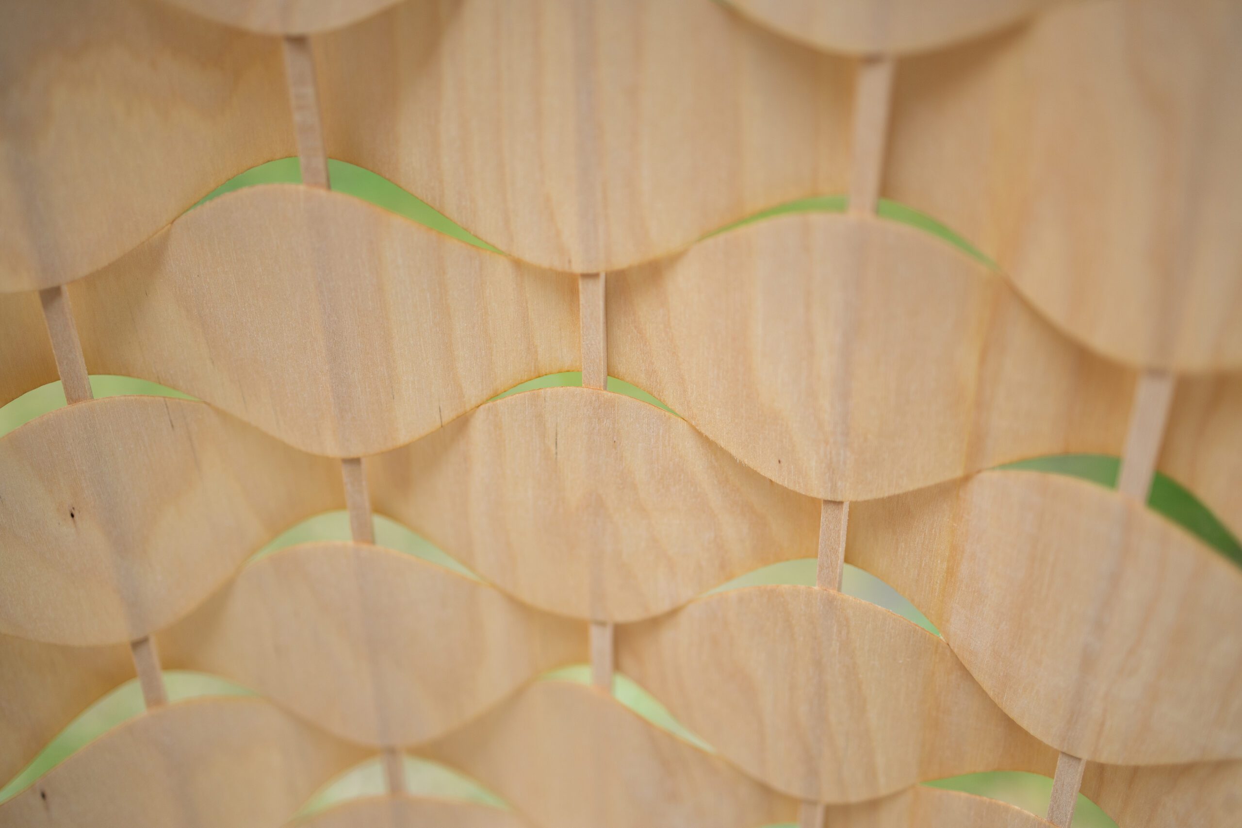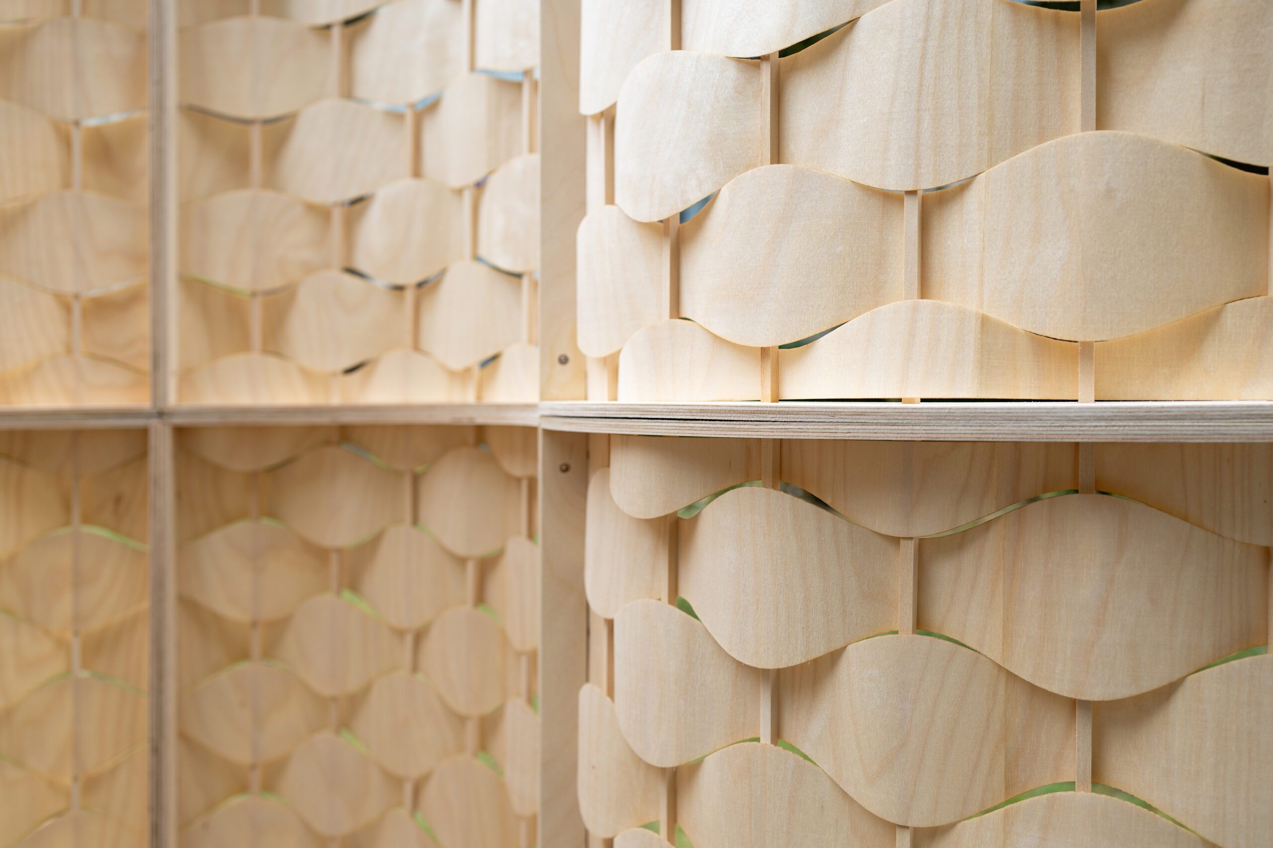Em vez de depender de complexidade tecnológica ou controle artificial, o projeto recorre à inteligência intrínseca dos materiais naturais. Inspirada pelas técnicas tradicionais de cestaria, a fachada transforma a capacidade higroscópica inata da madeira em um tecido responsivo. Cada ponto funciona como um poro, apertando ou afrouxando com as mudanças ambientais, criando uma trama viva que respira com seu contexto.
